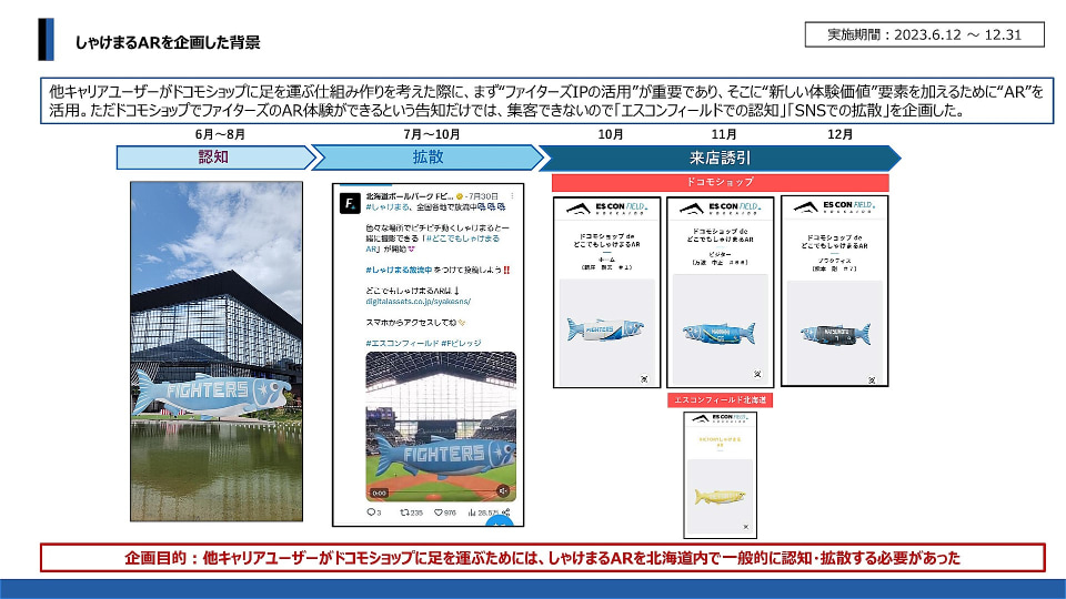 2023年に実施されたしゃけまるを用いたARコンテンツは、6月~8月にエスコンフィールドの池、7月~10月に公式Xアカウント、11月にキャンプ中のエスコンフィールド、そして10月~12月にドコモショップでの取り組みと、変遷していったことになる。