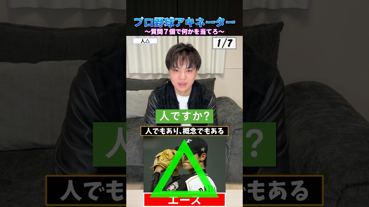 メタ 選手じゃないやつ人ですか? 三角。 三角バッターに関連しますか? いいえ。 いいえ。現象ですか? いいえ。 ええ、 現象でもない。人が関連しているバッターでもない。球場にいますか?三 角。三 角。え、でも例えばマスコットとかだったら、ま、丸で そうね。 球場にいる三角。投関連ですか? よし。じゃ、あと2つあるから。 うーん。前球団にいますか? まあ、はい。 全球団。 ま、なんとなくイメージ分かった。エースか勝利の方程式守護士そんなもんだろう。 主に先発ピッチャーに使います。 よし、来た。 いや、これバツだったらね。行きやす。いいす。 正解。 よし。 行けてよかった。
