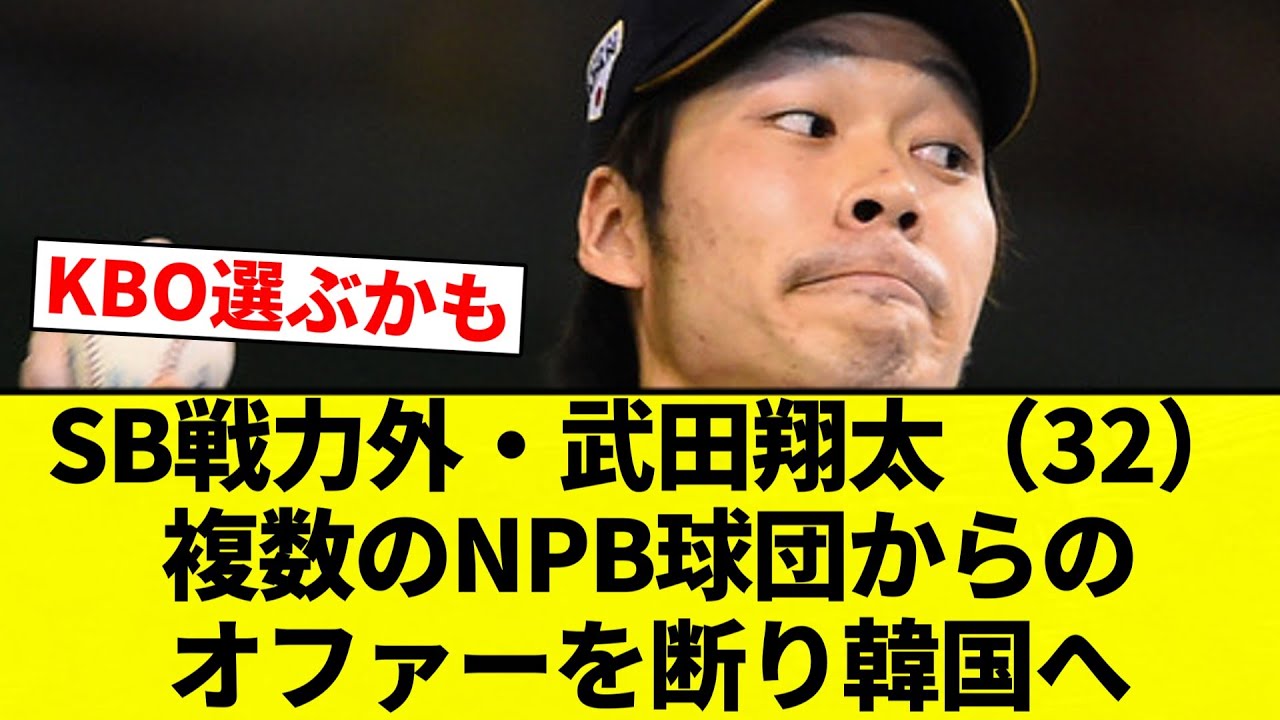 SB戦力街武田シ太32複数のNPB球団 からのオファーを断り韓国へ。武田の KBO挑戦について韓国メディアスポーツ 挑戦の名なユ記者はこのキャリアでなぜ KBOリーグに来る選択をしたのか。 SSGが日本人の大物アジア枠選手を獲得 した途した記事を掲載。NPB236勝を 上げた本物の実力者だ。入団当初から2台 メダルビッシュと呼ばれるほど期待されて いたソフトバンクを去ったとはいえ、武田 ほどの実績を持つ当手が韓国に活躍の場を 求めるのは意外と言えると報じた。続けて 同期者は今期のソフトバンクからの年は 1億5000万円。一方のSSGでの年方 は約3000万円と大幅ダウンだ。しかも 武田には複数のNPB球団からオファーが あった。先発後、6番手として十分戦力に なると評価されていたにも関わらず、武田 はソフトバンクを離れた直後、自らSSG に連絡、韓国挑戦を選んだのである。遠き を示した。NPBでオファーあったっての が嘘っぽい。100勝以上してると思って た。ヤクルトやろな。それなら韓国の方が ええわ。オファー育成とかじゃね。 セリーグで投げてから韓国でもええやろ。 大胆な決断やな。ヤクルトと楽天ならKB 用を選ぶかも。あったら選ぶやろ。NPB から3000万以上のオファーないやろ。 育成やろな。謎すぎる決断やな。韓国で CM収入が期待できるとかない。それ 合わせたら6000万円ぐらいの期待値に なって日本より稼げるとか。日本でCMは 無理やろうし1.5億ももらってたんか。 本無双で自分も行けると思ったか。神宮で お仕事と海不人気触手ヤクルトで0勝5敗 80とかならマジで終わるもん。韓国で 10勝した方がええ。空韓国に逃げた方が いいよ。韓国の球団も貴重なアジア枠を 稼働できない投資で埋めていいの?西武か もしれない。韓国で無双してメジャーに 行く策略や武田すら育てられなかった ソフトバンク。仮にあっても育成やろ。 そりゃ3000万選ぶわ。ご視聴 ありがとうございました。 [音楽]