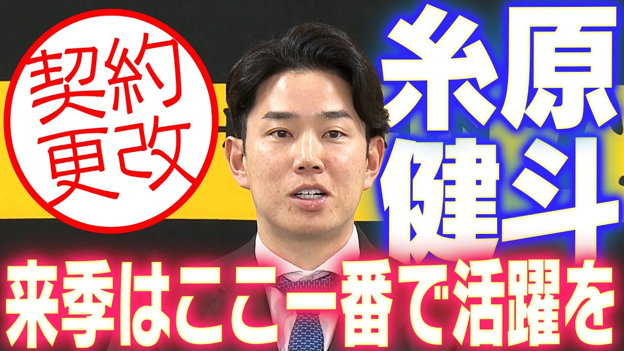 トラバンチャンネルですか? じゃ、テレビ代表でABC が質問させていただきます。よろしくお願いします。 お願いします。 え、まずサインはされましたか? しました。 ゲーム範囲で内容はおいてないようでしょう。 全然憲法です。 球団からはどんな言葉、お話がありましたか? まあ、そうですね。ま、来年頑張ってくれた。はい。ま、あと、ま、代打でここ 1 番の、え、ところで、え、ま、そういうヒットだったり、そういう活躍をお願いしますと、はい、言われました。 で、去年は、え、 FA 講せずに単年での契約でしたけど、今年はいかがです。 4丹念で。はい。 それはどういった思いです?も本成績も成績ですしはい。しっかり、え、来年、え、活躍できるように頑張るだけです。 今年のチームはレビューもされまして、糸原選手にとってはこの 1 点どんなシーズンでした?もう個人としてはい。 悔しいシーズンで、ま、最後も日本 シリーズもCSも、え、出場してないんで 、ま、終わりも悔しい思いしたんで、ま、 でも しっかり、え、来年に向けて、え、 本当頑張るだけなんで、ま、しっかりオフ 自分追い込んでやっていきたいなと思って ます。 原口選手も引退されてこのハ抜きの野手が取り少なくなりましたけど原選手自身のチーム内での役割ですとか立場とかの変化感じるところありますか? [音楽] ま、もうはい。ま、すごい選手たくさんはい。強いチームなんで、ま、自分もそれにしっかり、え、ま、ついていけるっていうかはい。 チームに貢献できるような活躍をしないとダメだと思うんで、ま、しっかり自分のこと一生懸命頑張るだけです。来勢の思いお願いします。 いや、もう本当、ま、まずは自分が活躍できるように、え、このオフしっかり、え、北抜いて、ま、またそれでチームに貢献できればいいと思ってるんで、本当頑張るだけですよ。はい。 最後にカメラに向かってタイガースファンに向けてのメッセージをいただいたんでしょうか? はい。え、来年も、え、応援よろしくお願いします。頑張ります。 [音楽] [拍手] [拍手] [音楽]