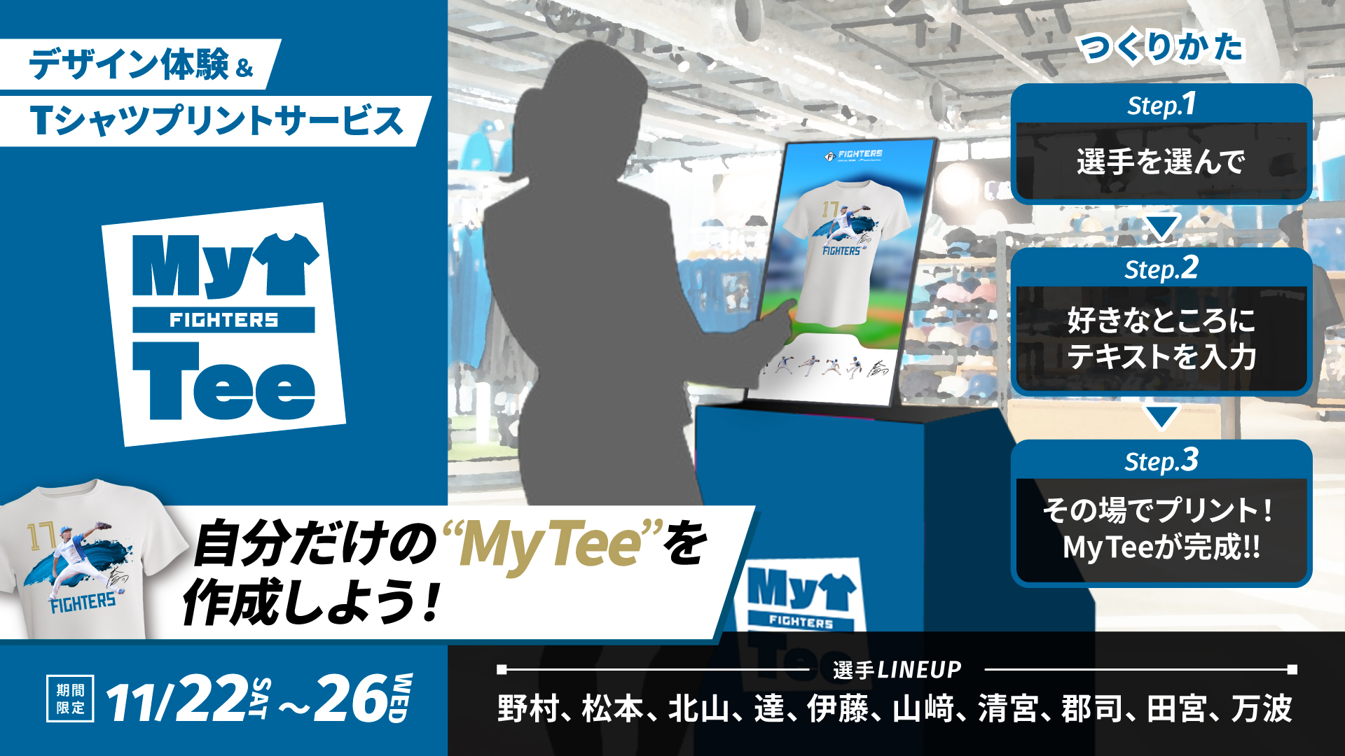 オリジナルのファイターズTシャツが作れる新サービス「FIGHTERS My Tee」が期間限定で登場!ライブ感あふれるデザイン体験を楽しみながら、あなただけの「好き」をカタチにした1枚を手に入れましょう!