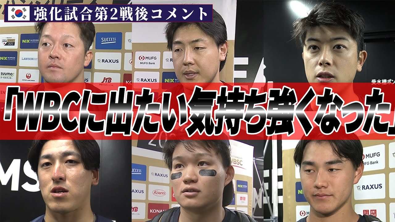 まずは久しぶりに日を背負っての大事 2 試なりましたが聞いていかがでしたでしょうか? いや、あのいい経験になりましたし楽しかったなと思います。 昨日もそうでしたけど今日の特にあの代打のコールの完成がすごかったですけど、球助場の雰囲気っていうのはどう感じられましたか? いや、本当にあの大きな声援をいただいたんですごくありがたいなと思います。 2年前のWBC 以来のサジャパンだと思うんですけれども、何か思い出したことだったり、逆に新たな発見だったり、どんなことを感じられましたか? いや、ま、やっぱりこのユニフォーム来て戦うっていうこと栄なことなんで、え、また切られるように頑張りたいなと思います。 [音楽] チームのメンバーもあの都した後輩が増えてきた中で雰囲気っていうのはです。 はい。 もうすごい楽しくやらしてもらいました。あの、第 7WPC がもう近づいてきていますが、あの、また日の丸をせようというところで今のお気持ちとしてはいかがでしょうか? いや、そうなれば嬉しいですし、ま、僕は僕で頑張りたいなと思います。 今日第2戦終わりました。あの、今日4 番での必要になりましたけど、今日1 日いかがでしたか? はい。 え、ま、最終的にお点で追いつかれてしまいましたけど、まあ、日本の野球としてはいい野球はできたじゃないかだと思います。はい。選手、ご自身としては [音楽] 3 出失となりましたけども、その辺りこう打席で意識とか、え、できたことできなかったこと、その辺りはどうでしょう? まあ、そうですね、無理に打ち行かずはい。しっかり頼極められたんでよかったなと思います。 昨日もでしたけども、ま、韓国の先発 ピッチャー、ま、なかなか1巡目ではこと いうところまではいかなかったかなと思い ますけど、その辺りの難しさっていうのは 牧選手どう感じてますか?そうですね、 やっぱり昨日京都、え、先発ピッチャーで なかなか初回から思うより形できてないの で、ま、そこは1つの課題ではあるのかな と思います。はい。今回宮崎も含めて、ま 、1週間今日このチームで過ごしました けども、このチームこう雰囲気というか、 ま、選手どういう風に感じてました?うん 。 今日もやっぱ代表として来てるわけですし、え、自分のやること、やるべきことっていうのは分かってる選手が多いなと思、多いというか、そういう選手たちがれてると思うので、え、はい。そういう人たちのこう高め合っていきながらできた期間になったなと思います。 なんか、ま、去年の画宿とかもありましたけども、なんか WBC を直前にしてるちょっと緊張感みたいなものを我々は少し感じたんですけど、牧選手は中でどんな風に感じました? [音楽] いや、そうですね。もちろんなんか、ま、 いつもと違うということではないんです けど、緊張感ていうところ、え、その助の 雰囲気もはい、何かこう違う なっていうところはありったかなと思い ます。なんか選手たちの会話とかもやっぱ WBCって言葉が出てきたりはする感じ ですか?そうですね、もちろん。はい。 あの、改めてこの期間は経て、え、牧手、ま、 WBC の俺の思いというのがなんか変わったりとか強くなったりとか、その辺りはどうでしょう? いや、もちろん強くなりましたし、え、来年に向けて、まあいいみできればなと思います。あ、ごめん。はい。選ばれた際には、え、チームのためになんとかできるように頑張りたいなと思いまして。 公式戦では久々のセンターの趣でしたけども、振り返ってみていいか? え、ま、え、無事にまずは終えれたんで良かったなっていうことと、え、ま、こういう機会に経験できたっていうところが自分の自信にもつがるので、この経験を生かして、え、頑張りたいなと思ってます。 ま、レフトの西川選手とも工作する場面もありましたけど、あの場面はどういう感覚だったでしょうか? ま、やっぱり完成もあるんで、多少こう声だけじゃ聞き取りづらい多分お互い出してたと思うんですけど、ま、その中でね、ま、練習試合でこういう強化試合でああいうプレイが出たってところは、ま、逆にプラスに捉えていいのかなって思ってます。 [音楽] ま、バッティングでは2 試合続けてヒットは出ましたけども、そこに部分についてはいかがですか? ま、もっとアピールできるところもありましたけど、ま、自分の持ってる、ま、 100% は、え、ね、試合に出せたと思うんで、まあ、また、え、本戦こう出れるように、ま、あとは、ま、ゆっくりしながら待ちたいなと思います。 ま、改めてありますけども、この期間経て WBCA の思いっていうのは森下選手にとってどういう風に感じますですか? いや、もちろんね、1 つ目標である、え、大会なので自分としても出て活躍したいなっていう思いもありますし、え、ま、こうやって韓国戦もやってみて、ま、すごく日本代表で戦いたいなっていう思いがはい。強くなりました。 ま、WBCまで4 ヶ月後ってなりますけども、このオフシー