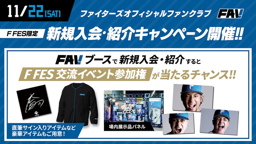 オフィシャルファンクラブFAVでは、11月22日(土)にエスコンフィールドHOKKAIDOで開催される《F FES 2025 Supported By Fanatics》で、新規入会キャンペーンを開催いたします。