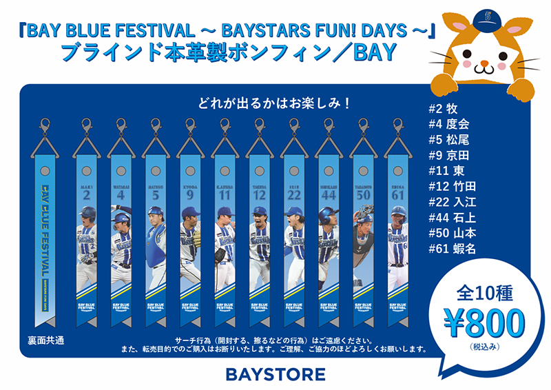 『横浜DeNAベイスターズ BAY BLUE FESTIVAL ~ BAYSTARS FUN! DAYS ~』の開催に際し、今シーズンのプレイ写真を活用した本革製のボンフィンをご用意いたしました!「BAY」と「BLUE」の2種それぞれ10選手ずつのブラインド展開となります。