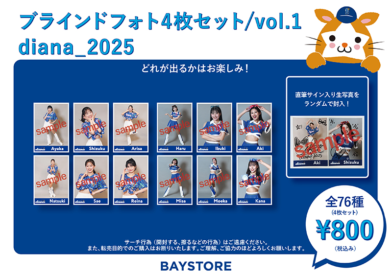 またdianaが『YOKOHAMA GIRLS☆FESTIVAL 2025』のイベントユニフォームを着用したパターンと、パーティーグッズを身に着けたパターンの生写真をシャッフルし、4枚セットで発売いたします。