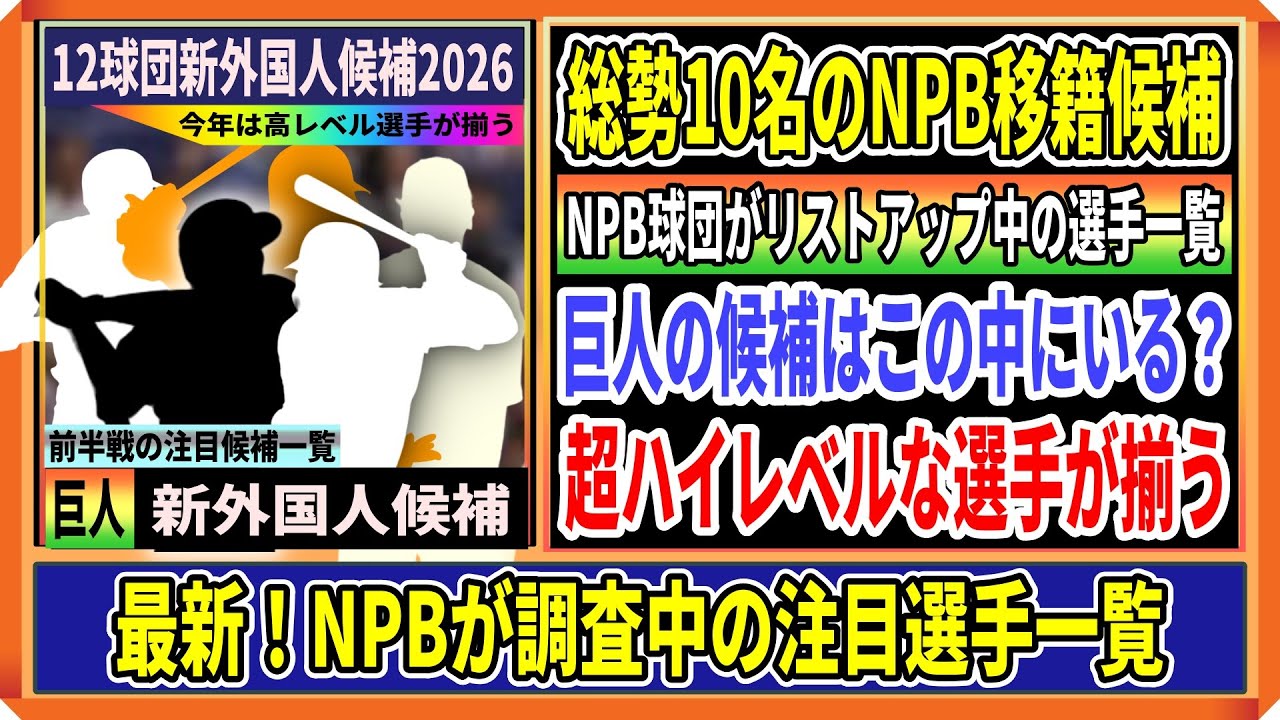 皆さん、こんにちは。というわけでですね 、え、今回は、ま、いよいよぱ12球団の 、え、コンオフ、ま、来に向けての新外国 野種、え、ここがね、ちらほら、え、 決まってきております。ま、例えば阪神 タイガースとか、え、オリックスとかが ほぼもう決定的な状況で、あとNPB球団 が、え、リストアップしている、ま、選手 の中で、え、ま、その選手の1人が西武の 公式SNSをフォローしたりと、ま、結構 動きがありますんで、ま、今回は、え、 マイナFA選手、そして、え、NPBA 球団が、ま、調査もしくは、え、リスト アップしている、ええ、全選手、え、ま、 前半戦の、ま、投かすということで、え、 まとめてみました。はい。え、では次の 画像になりますが、こちらの画像が、ま、 総税、え、10名の、え、選手たちを求め た、え、中の、え、NPB球団が、え、 主に、え、リストアップしている選手の 画像になります。え、そして今回、え、 紹介している、ま、10名の選手たちは、 え、もうほとんどがこの動画に、え、個別 で、え、まとめておりますんで、ま、興味 がある方は、ま、直近に全て投稿している と思うんで、え、ま、是非、え、その動画 を見ていただければと思いますが、ボブ シーモは、え、この選手のNPB球団の、 え、調査情報はなかったと思うんですが、 ま、ただ、ま、マイナーで、え、今期ね、 え、30パスともう12を争う、え、パー の持ち主っていうことでね、ま、多分 オリックスが1早く目をつけて、え、もう まとめた選手ではないかなと思います。1 塁種で、ま、マイナー通算、え、2割8部 3輪、え、89本。OPSももう900 近くっていうことでね、もうかなりいい 選手、え、ではないかなと思います。え、 この選手に、え、オリックスの、え、合意 報道が出ております。え、そして、ま、 ハロルドカストロ選手なんですが、ま、 この選手が、え、NPB球団が、え、調査 している、え、ま、選手の1人だと思うん ですけど。で、この選手が西武のあの公式 SNSをフォローしたんですよね。ですの で、ま、ちょっと、え、西武ファンの間で ざついているんじゃないかなと思います。 はい。え、そして、ま、残る、え、よさン 、ダザーミゲル、え、佐野、そしてサム ヒリアード、え、そしてファンイエペス。 え、この4選手もNPBが、え、調査して いっていう噂されている、絵選手で、ま、 例えば、ま、米野さ選手も、え、ミジャー では4本ながら、ま、マイナーでは、え、 通算打率がね、3割超えっていう、ま、 注目したい選手の1人ではないかなと思い ます。マイナ32本。え、そしてミゲルさ の選手なんですが、ま、この選手が、ま、 32歳と、ま、今回の中では、え、1番 年齢が高くで、今ね、あの、当期リーグに 参加してるんですけど、ま、ちょっと故障 したようなんですよね。で、えっと、復帰 時期が12月予定っていうことで、ま、 あの、そこら辺の、え、ま、過去の故障歴 とか今回の故障もひょっとするとその懸念 材料の1つに、え、なるかもしれない。ま 、そんな感じの選手ですが、ま、ただもう マイナー通算、あとは、え、ま、メジャー 通算もね、で、あの通算のオプスですかね 、もう、あの、断地にね、もう1番ズば 抜けている、え、選手ではあるんですが、 ま、やっぱりあの年齢を重ねる、え、ごと によって、え、成績に限りが、見えてきて いた、ま、選手の1人っていうことで、ま 、今後あの注目の1だと思います。そして 、え、サムヒリアード、この選手が、ま、 現在31歳っていうことで、ま、唯一あの センター候補に、え、入るんじゃないかな と思います。で、あの、マイナー2もね、 136本、オプスも855とで、メジャー でも44本の実績があるんで、あの、選択 肢とすれば、あの、ひょっとするとここは 、ま、個人的な予想になりますが、え、 今度次回ね、そのメジャーのDAになった 、あの、そういういい選手もいるんで、 またそういう選手のまとめももうしたいん ですけど、もう年を越してもいいよ。もう 来年になってもいいんで、もうバリバリの そのメジャークラスの選手が欲しいよって いう球団が、え、ま、そういう選手を狙っ た後にその取れなかった場合の、えー、 じゃ次のその、え、候補のね、え、1人に なりそうな、ま、とにかくでも筆頭候補で もね、その近年その上がりそうな対象の 選手だったんで、あの、センターもしかも 守れるあの、長距離法候補なんでね、え、 この選手もすごくあの、いい選手ではない かなと思います。そして、え、もう1人 ファンイエペス選手27歳、え、メジャー で、え、20本の実績があります。で、 マイナー通算も100本近く打っている、 え、長利法でNPB球団が、え、 リストアップ、え、獲得調査をしてい るっていう噂があります。はい。え、では 次の画像になりますが、え、こちらの画像 が、ま、個人的主観ではありますが、え、 マイナーFA選手の、え、注目の候補の中 から1塁、え、3名をピックアップしてい ます。え、まず、え、1