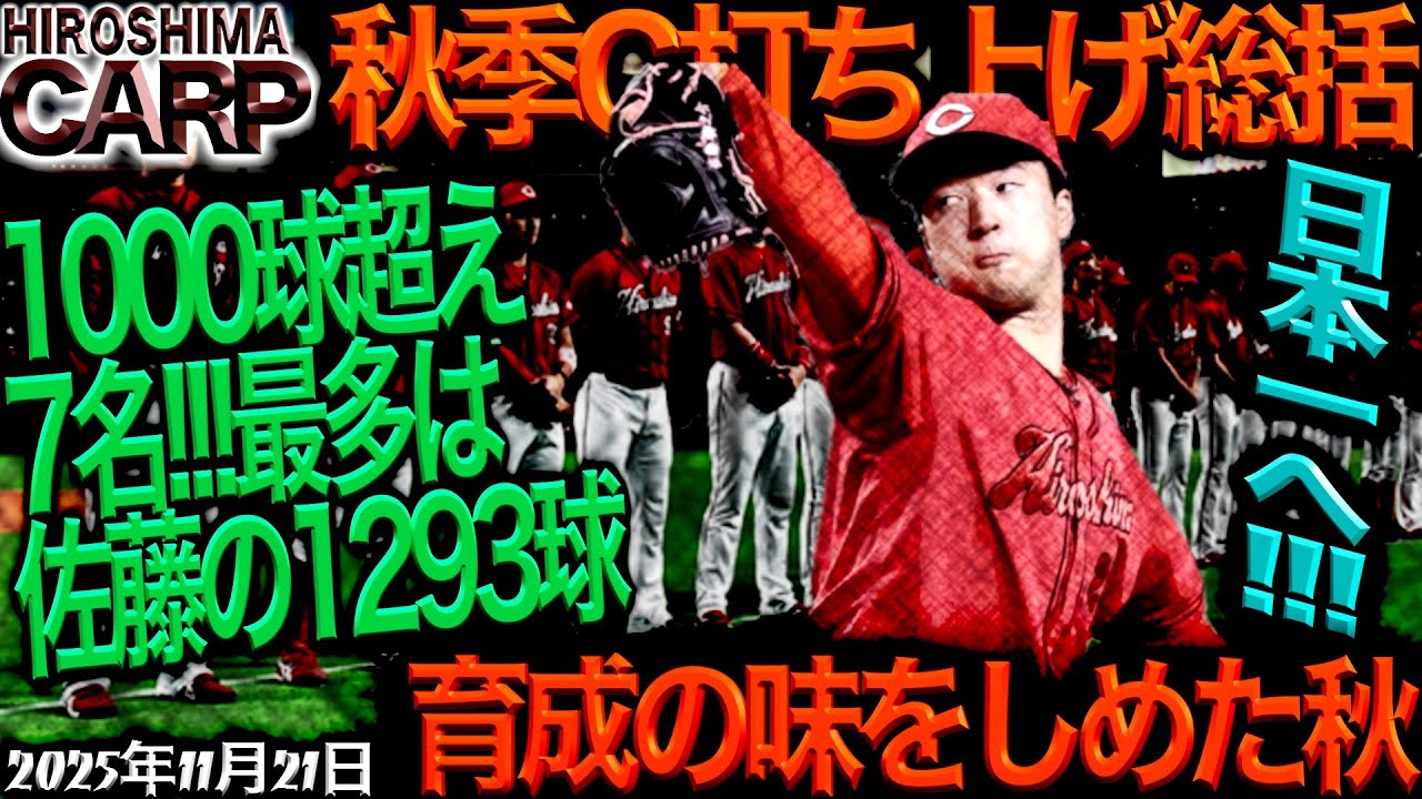 お疲れ様です。KTです。今日は11月の 21日ということで、本日もKT チャンネルご視聴いただきまして ありがとうございます。金曜日の夜元気 よくやっていきたいと思いますので、最後 までお付き合いよろしくお願いいたします 。はい、というわけで、え、今日は広島 カープ周期キャンプ打ち上げと、え、いう ことで皆さんね、充実の表情で、え、 キャンプの方を打ち上げております。ま、 これであのユニフォームを着てという、ま 、野球をするというところで行きますと 一切りかなということになりますんで、ま 、今日はちょっとポジティブにね、え、 前向きに喋っていこうかなと、明るく喋っ ていこうかなという風に思っております。 で、ま、残すイベントでいくと月曜日かな 、あの、ファン感謝でありますんでね、ま 、そこでなんかこうビッグサプライズが あるのかなみたいな、え、ちょっとね、 期待する声なんかも聞こえてきますが、ま 、あの、大きなイベントでいくと、え、 そこありますんでね、え、皆さん楽しみに 、え、待って、え、くださいと、え、いう ところではございます。はい。で、ま、 シーズン終わって新井監督のあのコメント ですね、厳しい年になりますと、え、いう ようなところから始まったこのオフでは ありますが、ま、キャンプ、あの、色々 あって私もね、ちょっと否定的な意見も たくさん喋らさせていただきましたが、 まあ、なんて言うんですかね、そのオフ、 うん、今年のシーズンの終盤、それから このオフが始まったあの段階よりはなんか ね、こう明るくなってきたかなと、え、 いうようなね、ま、私の気持ち1つかも しれないんですけども、もうちょっとこう 絶望的なね、来期に向けて絶望的なこう オフになっていくのかなと、え、いう風に 思っておりましたが、ま、ドラフトも うまくいったというところもありますし、 この秋のキャンプ、ま、あの、いい悪いは 別としてね、え、本当にこう体を追い込ん で追い込んで追い込んでと、え、いう キャンプになりましたので、ま、その辺が 、え、来期身を結んでくれると、え、いい なという、ま、期待、希望も込めてなん ですけども、ちょっと、え、期待できる この11月になってきているかなと、いう 感じはしております。ま、そんな中でです ね、あの、ピッチャー陣で行きますと、え 、先球投げたピッチャーというのがなんと 7名いると、え、いうことで、もう投げて 投げて投げてと、え、いうことで、ま、 ここに関してもね、あの、ちょっと否定的 な意見言わさせていただきましたが、ま、 これが良かったか悪かったかというのは こう来年の結果で、え、判断するしかない のかなと、え、いうところがありますんで 、ま、あの、かと言ってね、選投げた からオッケー、選投げてないからダメだと いう評価ではないと思いますんでね、ま、 この練習があ試合の結果、シーズン通して の試合の結果にこう繋がってこれれば 良かったものだということでね、ま、評価 は後から出てくるものだと思いますんで 難しいところではございますが、ま、あの 言ってもね、こうたくさん投げた選手は こう自信がついたんじゃないかなと、え、 いう風に思いますんで、ま、あの、それが ね、技術的に、え、上達したかどうか 分かりませんけども、少なくとももう たくさんこんだけ投けたんだと、え、俺は もうやれること全部やったんだという自信 にはなってくるという風に思いますんで、 ま、あの、高校生、大学生ではないんです けどね、プロの世界なんで、その地震だけ で、え、抑えれるほどね、甘い世界では ないと思いますが、あの、ま、ないよりは あった方がいいということでね、え、来期 にこうつげていって欲しいなという風に 思います。はい。で、ま、そこでいきます と、ま、周期キャンプは、ま、元からね、 あの、若手中心にというような位置づけに はなっておりますが、ま、特に今年でいく と、え、カープ珍しくね、あの、戦力構造 という選手をたくさんね、え、出してと、 え、いうことでもう若手にシフトしていく ぞというような、こう決意がね、あのオフ の早めから始まっていたというところも ありましたんで、もう本当に新井監督もね 、あの、この若手を育てんと来はどうにも ならんと、え、いう危機感もあったという 風に思います。ま、ちょっとね、突然の キャラ編ということで瞑想している部分も 、え、あるかもしれないんですけども、ま 、なんとなくこう育成の味をこう閉めた秋 になったんじゃないかなという風に思い ます。ま、去年まではね、あの、ま、秋の キャンプにはいなかったんですけども、 ちょっとベテランなんかにも、え、気を 使ったりしてという雰囲気がこうひシひシ と、え、伝わってきたんですけども、もう そこへのこうなんて言うんですか、忖度と えいうのはもう来年はしないよというよう な、こう決意もね、え、見られますでいい かな。はい。見られ