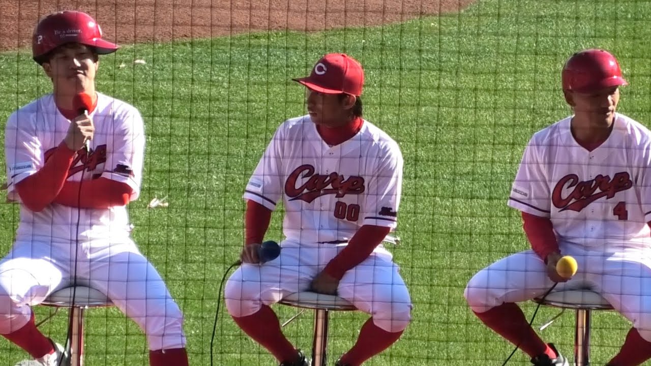 どうぞ。 今スペシャルカープファン感謝 2025 松田スタジアムからテレビの前の皆さん、そしてスタンドの皆さんと一緒にお送りしています。 早速選手に来ていただきました。 それではこのプログラムのテーマを発表します。 皆さん、大型ビジョンに注目です。プログラムのテーマはこちら。 カープ盛り上げただいま ジ ということでご紹介しましょう。選手龍太郎選手野選手です。拍手 来てくれましたね。 盛り上げてくれます。 まず何このおしゃれヘルメットの顔だったんですけど皆さんがですね早くも盛り上がりそうなグ物を持ってるんですね。え、選手を皆さんが持っているのは新しく生まれ変わったカープファンクラブ赤組に入してポイントを貯めると交換できるの 1例す。 はい。小野選手、浦選手が持っているタオルはご自身のあタオル。 そして選手が持っているのが裏下がりアクリルキーホルダーとカープ坊やマスコットキーホルダーとなっています。 はい。皆さん持っていただいてますが代表して子園選手に伺います。 はい。 新しく生まれたファンクラブやオリジナルグッズご覧になっていかがですか? あれ?これあの配信対じゃないですよ。 違う。あ、違う。黄色いです。 黄色だったんですけど違うです。 はい。 見てどうですか? いや、なんかこうやって作っていただけるんでありがたいなと思。はい。 あ、新鮮だよね。 はい。 めっちゃいいですね。はい。 ね、ファンクラブの名前が赤組ということになりましたがどうですか?色々変わります。これからファンの皆さんにどのように楽しんで欲しいですか? いや、ちょっとあの、 さっき来てこれ言われたんで皆さんちょっとあの、温かい目で見ていただける。あの、全部言うんですね。 でも一緒にこうね、ファンクラブに入会して盛り上げてほしいですね。 はい。と思います。 はい。 なおですね、本日は常正面グッズショップ向いの特ブースでポイント交換オリジナル グッズの展示を行っておりますので、え、場の皆様は是非お立ち寄りください。 え、テレビをご覧の皆様もカープ公式ホームページでラインナップをご覧いただけますので、是非ご確認いただき新しく生まれ変わったフパァンクラブでカープを楽しんで盛り上がっていきましょう。 さあ、それではカープ盛り上げたのお参加のお話を伺っていきます。どうぞ。 はい。かにもね、この 3 人盛り上げてくれそうなメンバーとなっていますが、 まあ、今シーズンをね、ちょっと振り返っていただきたいんですが、井さんね。 え、まず矢野選手はい。 ちょっと苦しみましたね。 そうですね。 バッティングの方が はい。 何か掴みただ秋のキャンプではすごくいいものをこう出していたっていう風に聞いたんですけれども、何か掴んだものっていうのありますか? はい。 いや、まずあの土台作りっていうのをテーマに うん。 はい。あの、フェンキスからやったんで、 ま、そこが重要にはい。良くなってきてるかなと思います。 なるほど。ありがとうございます。そして、初木選手、 初木選手。 今日今年もほぼキャリアということで打率立の方も盗塁の方も素晴らしい成績残しましたけども手応え的にはどうでしょうか? え、そうですね。7年間やってきた中で1 番良かったかなってシーズンになりました。 おお。 じゃあ小子選手 はい。 タイトルまずおめでとうございます。うございます。ございます。 ありがとうございます。 最高、そして侍も今シーズン振り返ってみてどうでしょうか? はい。ま、個人的には本当にいいシーズンになりましたし、 あのはい。成長できたかなと思います。はい。ありがとうございます。 これね、僕ちょっと聞きたかったんですけども、 こみんなが隣にいる人どういう風に映ってるのかなっていう左隣で行きましょう。 あ、面白どういうそうです。そうです。そうです。印象、 印象です。選手は初選手のとこどう思ってるのかなっていう。 どう思ってたんですか? え、野球とかです。 そうです。全て全てでもいいよ。 あ、ま、あの同期で断させてもらって そうですね。 ま、僕も結構あの入った時足自信あったんですけども はい。 もう全然叶わなかったんでそん時からあ、もうこいつには勝てないなと思ったね。そう、そう。 いや、本当にあの盗塁するっていうか、あの強気なあの盗塁っていうのはなかなかまでできないのですごいかなと思ってます。はい。 初選手、矢野選手の方どう思ってますか? え、もう、ま、見ての通りはい。えげつない守備範囲と えげつない方と はい。ここの面白さす 面白い。 はい。ここ 面白い1 番真似したい方ですね。真似できないですけど。 なるほど。 近づきたいです。 スライを手ら付けてます。あの野選手どうしましょうか?スライについて話すかの選手について話すかどっちですか? スライオスライオ 江談で小で はい。はい。 え、もう全てあの野球の面においてあの生まれ変わりたいなと思ってます。みんなしっかりちょ