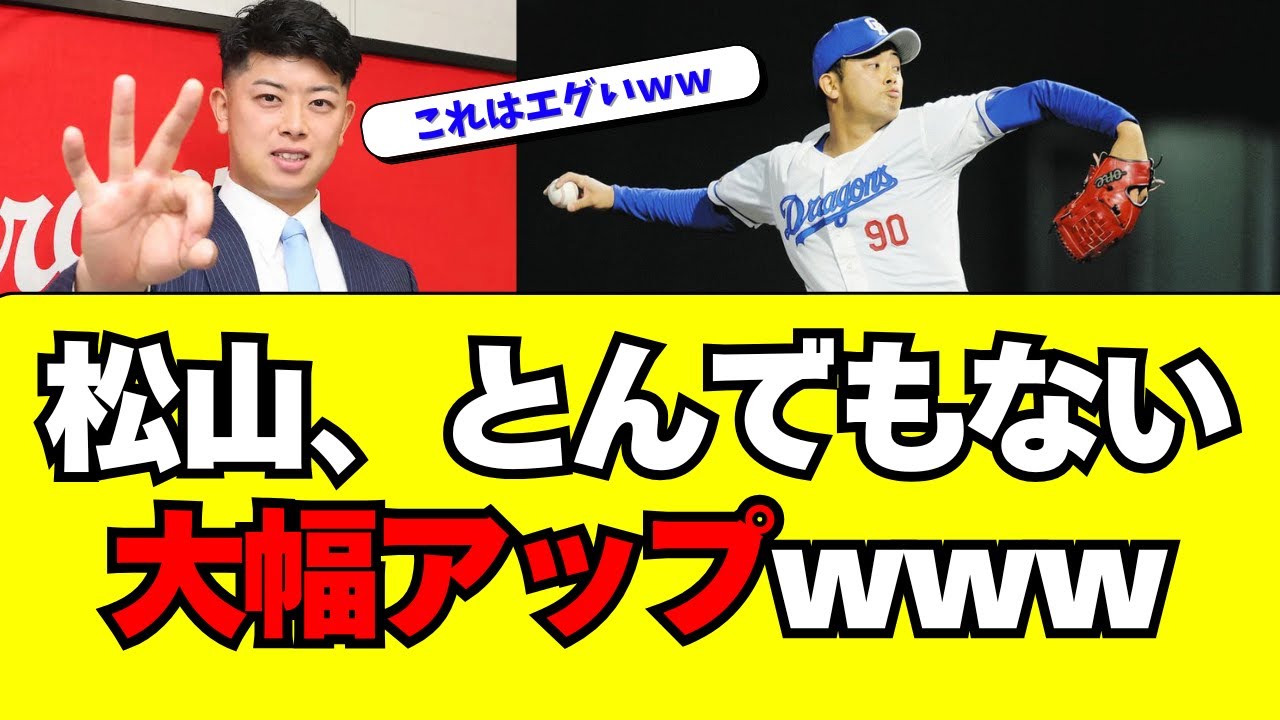 中西ドラゴンズの松山深夜投手とんでも ない大幅アップを勝ち取ったということで 見ていきたいと思います。 松山投手25歳で2026年が4年目の シーズンになるピッチャーです。 マルチネス投手が武球に移籍してしまった わけなんですが、その穴を埋めて開幕から 守護神として活躍した2025年の シーズン。ただシーズンの中盤で右肘の 疲労骨折という形で離脱となってしまい ました。7月の4日に登録勝されてそっ からかなり心配されたんですが8月には もう復帰して結局シーズン終えてみれば 最多西武を勝ち取るとようなそんな シーズンになりました。これまで以上に コントロールが大きく向上しまして、 そして脱算進率も前年と比べると大きく 向上しました。平均休速154.2km 。これはチームの中でもナンバーワンの 数値となっています。2025年は53 試合で1.54いっぱいホールド5つ46 西部52.2イニングでフォアボール わずか11個脱三振がイニングを大幅に 上回る72個左率が2割一部3輪1 イニングあたりのランナーが1を下回る 0.97という数字になっています。ま、 勝の投手がちょっと不調であったり、清水 投手が故障を抱えていたりという中でです ね、この松山投手の存在っていうのは来 シーズンとててつもなく大きくなってき そうです。ま、そんな中ですね、松山投手 契約公開で大幅アップを勝ち取るという ことで見ていきたいと思います。 まず松山投手のコメントから見ていくと 嬉しいですけれどももっと上を目指して やっていきたい。まずヤギさんに感謝し たいです。ヤ木さんが僕が無名の頃から 通い詰めてくれたことでここに立てている ので、まだまだですけど、今は素直に感謝 したいですね。と、ま、今後への向上心と 、ま、スカウトの山木さんへの感謝の コメントになっています。ま、元々ですね 、この松山投手は山木さんが注目して育成 で入団したピッチャーです。2023年1 年目は300万円からのスタートでした。 ただ36試合防御率が1.27ホールド 17個と素晴らしい成績を残します。 そして年方1750万円にアップして、 そこでもまた59試合防御率が 1.3341 と勝ちパターンで素晴らしい投球を見せて います。その投球が評価されて2025年 は5000万円にアップ。53試合、防御 率が1.54。そして46と先ほどもご 紹介した通り守護神として素晴らしい時を 見せます。 年には最優秀中継投手、そして2025年 には最多長ともうセットアッパーとして これ以上ない2年間を過ごしました。 2026年に向けて年方一気に上がりまし て1.25億円となりました。倍上の アップです。来シーズンも松山投手に期待 しましょう。是非松山投手へのメッセージ コメントに書き込んでください。ご視聴 いただきありがとうございました。