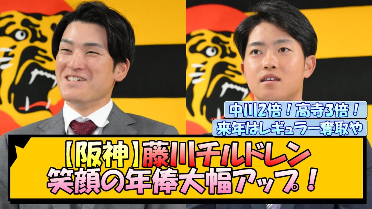 阪神藤川チルドレン笑顔の年方大幅アップ [音楽] 中川は倍増でサイン 高テは約3倍増となる1350 万円アップの2000万円でサイン 中川自分ではあまり想像していなかったというのが 1番ですね。 来シーズンはずっと1 軍で勝負できるような選手になりたい。 高テらしっかり評価していただきましたと 満面の笑み 2月1日から1番目立てるようにこのオフ にしっかり準備を チームとしてレフトとショートしかいのが 現状 その中で中川と高寺の2人はかなり頑張っ てたと思うで フルで出たわけではなくとも終盤まで一軍 に対したしな この経験を来年に生かしてさらな 飛躍を目指して欲しいわ。 まだまだこれからやで。これからも何の面白いすれを取り上げていくのでコメント、チャンネル登録、高評価よろしくお願いします。 [音楽] [音楽]