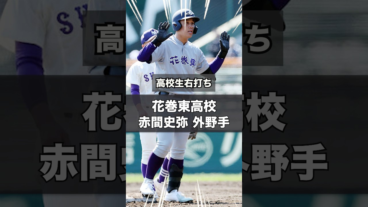 花巻東高校の赤間文ガ野州2008年7月 25日生まれ17歳身長は180cm体重 は98km左投げ右打ち岩手県盛岡市出身 で投手としてもマウンドに立つプロ注目の 高校生右打ちスラッカーです。1年秋から 5番レフトレーレギュラー出場し、秋の 岩手県大会では5試合で打率3割3部3輪 打点1で一時的に4番に入る試合もあり 2025年3月18日の春の選抜大会1回 戦で全国デビュー米子勝戦で初回に センターオーバーの2塁打を放ち3打数 2アンダ2打点の大暴れ続く3月26日県 高崎との準々決勝では4打数のノーヒット 試合も1対9で破れてしまいますが8回に リリーフで甲子園初登板もしています。2 年生になりました。2025年8月15日 の夏の甲子園2回戦では東洋大姫路に破れ てしまいますが、8回には3塁打を放ち、 2打点するなどフルスイングが魅力の バッターです。 [音楽]