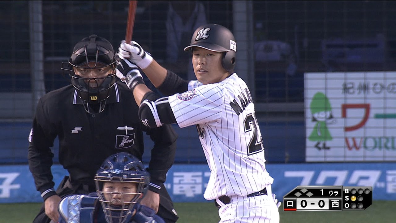 1回、この日一番セカンドで先発出場したドラフト1位ルーキー中村が放った打球はライトスタンドへ。嬉しいプロ初本塁打は先頭打者アーチとなった。 (4月30日 ロッテ-埼玉西武)