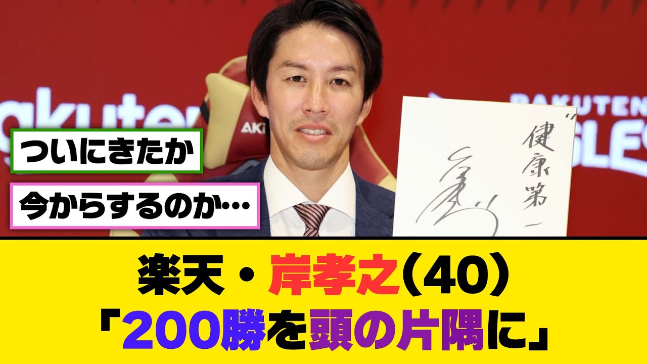 楽天岸40歳200勝の片隅に楽天の岸 当手40日本拠の楽天モバイルパークで 契約公開交渉に望み4000万円連の来年 1億8000万円でサイン8月26日の ソフトバンク戦で列370勝に到達し 200勝を頭の片隅に入れてやっていき たいとけの場で初めて200勝を目指す ことを誓った200勝を高言したのには 理由がある学年で、388勝のヤクルト 石川から解食の旅に200勝を口にして ほしいと言われてきた。それこそ170勝 を達成したことによってもうそろそろ口に 出してもいいのかなと思ったと明かした 作品まで共にプレイした巨人田中さんも 今期に100勝を達成。嬉しかったですよ 。ちょっとのところでなかなか達成でき なかったのを見てきた分本当に良かったな と思います。年撃を受けた。ついに来たか 。今からするのか。1でここから200 勝したらレジェンドに入るな。大卒で 200勝したら黒大来か。 10勝3 年連続って考えたら意外と余裕やな。 前剣と騎士の両方の200 勝を面倒見るのはさすがにきついやろ。 楽天主人を考えたら 3本の指に入るのがすごいわ。 マジで騎士いなかったらやばかったな。今年 飛ぶに変わったらかなり大変だろうな。 ウワンでここまで投げられるのは珍しいし頑張ってほしい。 ご視聴ありがとうございました。 よろしければチャンネル登録、高評価をお 願いします。