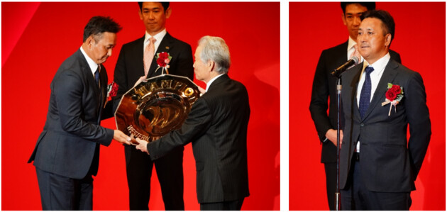 第二部ではセントラル・リーグ、最多セーブ投手賞の松山晋也投手、最多安打者賞、ベストナインに選出された岡林勇希選手、そして連盟特別表彰ではカムバック賞に選ばれた大野雄大投手の表彰が行われました。