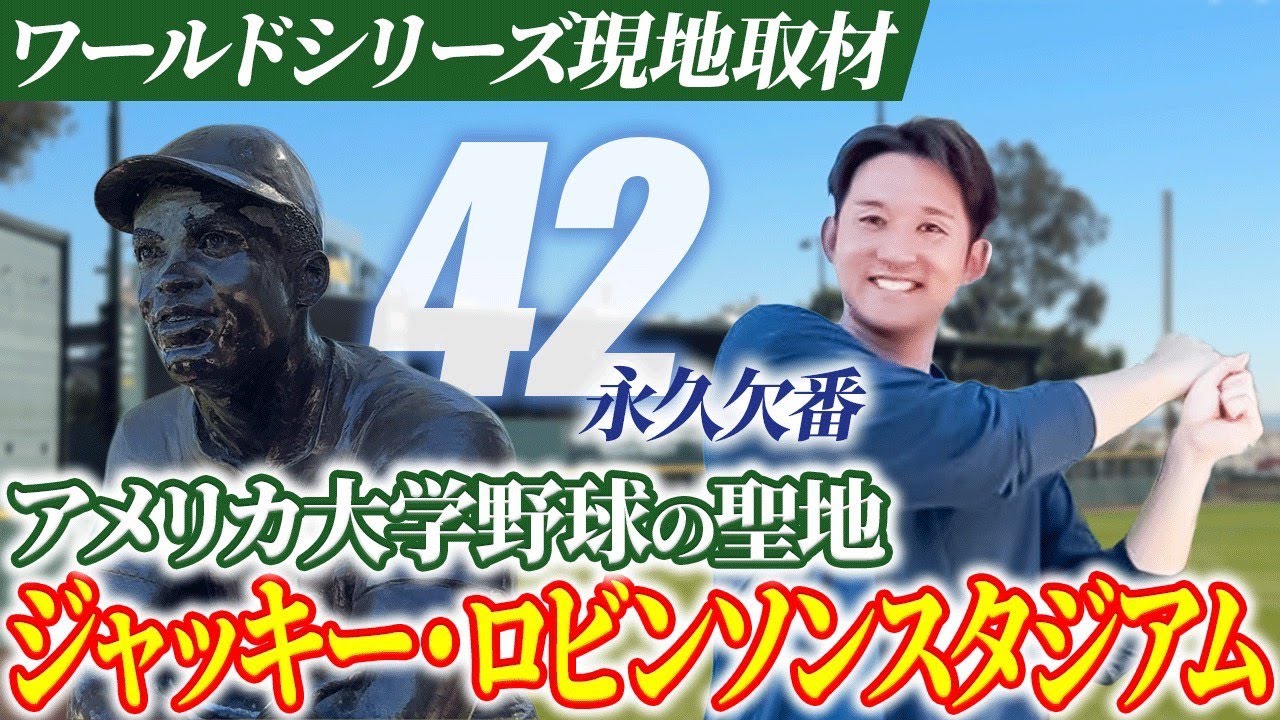この方では大リーグの歴史を変えた黒人の選手の初のプロベースボールプレイヤーということで WecamefromJA セチム平オタニ トミーエドマン ジャパニーズトミーエドマン いいよ。 さあ、やってまいりました。ワールド シリーズゲーム3を終えて今日はゲーム4 大谷選手の先発日でございます。その前に ま、ロサンゼルスといえばやはりここには 行きたいとずっと前から思ってましたので 、なんと今日ジャッキーロビンソン スタジアムに来ております。こちらです。 こちらですね。え、大学野球UCA のスタジアムとなっていまして、ま、日本で言ったら、あ、ま、ワ田慶王 うん。 そういったカテゴリーの、え、ま、本格的な大学野球の施設をちょっとこう見学させていただきたいということでさせていただきました。 行きますか? いや、でも太郎さん、もう早速ですけど、サブランドからそして室内練習上もうね、なんか公園の中に一部にいきなり大学の施設がドーンって出てきたような。行きます。ジャッキーロビンさんサジアム 行きましょうかね。 ね、 もう来た瞬間テンション上がってますね。 いや、なんかやっぱ今日なんかね、アリゾナのキャンプ地に来た。日差しもそうかもしれない。 うん。 今ね、大学野球はおシーズン うん。 に入っていまして、え、ま、選手たちは残念ながら午前中は練習はしてないということなんですけども、ま、やっぱこのグランド設備日ね、しっかり見ることができたらやっぱ嬉しいので、ま、この空間がね、一般にも解放されているという そうなんですよ。うわ、 Thisisベースボール。やばえ。 これ大学の施設なの?これ大学の施設ってこんな感じ?でもこれは早稲田大学とかでもやっぱこういうグランド施設なんですか? 早稲田大学の野球部はその多分日本の大学野球の中で見ても多分ほぼほぼトップに近いぐらいの うん。うん。 設備を持っていて うん。 それこそ人工芝は 6大学野球がある神宮球助と同じえ 作りになってるんですけど、そのね、早稲田よりもまたちょっとちょっと違うというかベースボール球場って感じだよね。なんか試合がやっぱやってるだけあって うん。 もう本当に球場電行掲示板もある。 うん。 で、あそこには、え、室内バッティング練習場もある。で、サブランドある。で、メイン球場。そ、メイン球場にはもう周りに、え、 3何席ぐらいのこれ?2000、3000 ぐらいの席かな? うん。 あってアナウンス室あるわ。 あれは。だから要するに放送席ね。 放送席 剣士 ああ、ジャッキーロビンソンおす。 お願いします。 お邪魔してます。 お邪魔してます。 ジャッキーロビンソン。 ジャッキーロビンソンさん。どんな方です? この方が、この方がやっぱこう大リーグの歴史を変えた黒人の選手の初の、え、プロベースボールプレイヤーということで、今でもこの 42番、こちらの 42番が、え、39 弾で永久決板のなっている背番号です。 この方がここに来てたんだ。 UCLAの出身。 出身でブルックリンジャース時代。 うん。 ドジャースのOBでもあるっていう。 そう。 いやあ、歴史を作った方たちお分けね、 UCAにバウ うん。 トレバーバウーとあとゲリットコール うん。 そういった選手たちもサイヤング賞を取った選手たちもここの卒業生みたいで うん。 なんかここで投げてたと思うとちょっとこう胸が踊るね。 ちょっとセンターの うん。 バックリーンの左側のわゆるバッターズアイの左下 はい。はい。はい。 MLBのロゴ見えますね。 見えますね。あそこにあ、ゲリッドコールトレバウって書いてるわ。 2023年2020年のサイヤング。 はい。 ちゃんと書いてますよ。 書いてますね。で、2人があれはUCLA のユニフォームを来て投げてる時の ユニフォームあの青学みたいなユニフォームなんだね。 確かに ねえ。 いや、見てくださいよ。電光掲示板の下には 42 うん。 ジキロビンソン。 このスタジアムのね、名前がついてるっていうのがすごいよね。 名門だよね。うわ、そりゃね、ちょっとアメリカで野球やりたいって気持ちになるわ。 大学やってみたいなっていう。 うん。 もし選択肢が 20年前20年前言い過ぎだ。俺14 歳だわ。 ま、でもその頃からね、考え始めるからね。 考え始めたら 高校その先の振路 ちょっとこうアメリカで今年もね、だってあの石川ケニー君 アメリカの大学からオーリックスに オリクスバファローズに指名されたんで そういったこうドラフトの選択肢も やっぱ幅広がってきてるんでやつしかなんかこう UCLAでプレイする 4人選手ちょっと見てみたいね うん ちなみにそのUCLA の伝統ぷりで言うとカレッジワールド シリーズというものがありまして はいはいはいはいはい 1969年97年2010年12年13年 2025年と今年 今年か カレジバルシリーズ優勝チームです。 今年優勝してる。 いや、それそうよ。だって来年 うん。 ドラフトの超目玉の選手が うん。 ちょ うん。 超目玉日本にも来日してて うん。 なんだかマジシャンみたいな守備すんだよ。 うん。 で、足早い。バ
