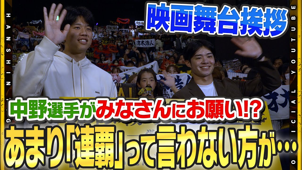 を ですよあれ すなんか いやいやいや着ですよ 。いや、そうね。30分前さすが。 いや、まあ、まあ、30 分前コード当たり前ですから。 社会人として 大として さすがですね。 早えって早え。これ何? え、これミセスのグッズす。 へえ。 格好はもうこの格好で出られるんですか? え、こうなんか綺麗目な格好出られたんで、あの綺麗なパーカー来てきました。 綺麗目なパーカー はい。 綺麗なパーカーをしていきましょう。 質の綺麗さ、 もう質がいいすね。はい。質がいいです。このパーカーはい。 絶対中野さんバチバチで来るやん。 映画館とか来ます。 映画館行きますよ。 なんかこないだスレッツでなんかおすすめの映画教えてくださいみたいな。 いや、そうなんすよ。え、それはネタ売りちゃうかな? あ、ネタ売りか。 あ、いや、おすすめの温泉じゃない? 温泉か。 映画はさ、なんか鬼滅の刃とかをずっと見に行こうと思って結局行かずあ、 よし、今日は明日は行くぞって心に決めて朝起きた時には家でゲームするってなってその日の気分次第 そうだよな。外に出ようってならんだよな。ミントビでもよく来てたけどな、高校の時。 ああ、 この辺。 え、じゃ、映画館、ここの映画館の、 映画、ここ、映画は大体ここっす。 あ、え、 で、この辺で飯食って友達とみたいな。 ここの青春時代はいるんだ。 ま、言うたらここ似合わすね、僕。 あ、 似合わっすね。はい。完全に 敷地内す。 あ、じゃあもう、もう、もう 所有値です、僕も もうじゃ、本地でも全然もう、 あ、もうだからもう今日これ綺麗なパターなんで。はい。 今日はあのタオルとか持ち込みオッケーな上映な。 タオル持ち込みオッケー。あ、このイベントあるって知ってるのか? 知ってる人がそうです。抽選で当たった当たった人が 抽 抽選で当たった人がこのこの映画見てるってことですけど。 見てる。 へえ。今回ちょっとわかんないですけど前回は 1万人ぐらいあったみたい。 え、1万人? はい。300人ぐらいしか入んないのに。 すごさん、今回何人オーブすか? いや、まだ聞いてないわ。 おお。 前は誰?近松さんとか。 そうした。 これで少なかった時には行く。 あ、は行かないす。行かない結局。 はい。 もうトレーニングで もうトレーニングすね。 ちょっと時間ないんで。 6000やって。え、 556000 負けた。4000 人負けた。中身さんのせにしとこう。ちょ、えぐいって何時間運転したの? ヘイヘイヘイヘイヘイヘイ。大丈夫ですか?大丈夫ですか?大丈夫です。 大丈夫ですか? ちょっと暑いですね。 ここ真面目や。 いつやろ食べた? なかなか映画とかシーズン中。 いや、ないね。 あ、します。お願いします。 お願いします。 服装の温度さ。 これも普通に上がったらいいすよね。 こないな。 え、これが綺麗目の正解です。 これ、これな服。 僕は綺麗目なパーカーす。 き麗めな服装。僕は綺麗目な服す。 服装じゃ。 服装じゃないですか?服。 阪神タイガース中野選投にお越しいただきましょう。大きな拍手でお迎えください。 そうですね。 ま、あの、普段甲子園でも掲げていただいてるんですけど、 ま、なかなかこの距離感でタオルをこんなに見ることはないんで はい。 はい。 気持ちいいですね。 はい。再木投もいかがでしょうか? そうですね。ま、多分今日僕ら 2 人が来るっていうのは皆さん知ってたと思うんで。え、イナスさんにこの 2人以外のタオルあります?え、 あるよね。 そんなことありますか? あるあるあるある。え、 近本浩司 近さ。 前優勝した時にあのウイニングボールを自分取ったんですけど、ま、今回もこうウイニングボール飛んでこないかなっていう頭でずっと守ってました。 最後センターにフライが飛んだ時は中野選手の思いとしてはこうどんな風に見てたんですか? いや、もう早くマウンドに行きたかったです。 なるほど。待機投手はいかがですか?あの優勝の瞬間。 そうっすね。 ちょっと色々あったんで とても 複雑な感情でしたけどやっぱ優勝はこう積み重ねのものだと思うんで、ま、あの試合はあの試合ちょっと色々本当に色々ありましたけど、ま、でもやっぱチームが優勝してくれたっていうのはすごく嬉しかったですね。はい。 背番号が変わるということも発表されました。 51から7位の部分の位教えてください。 そうですね。ま、あのファンの皆さんの中にはい、もちろん 51番でっていう方もはい。 いたとは思いますけど、ま、自分の中では WBCでもちろん7 番つけてましたしうん。ま、 1 桁の番号をつけてはい。プレイしたいっていう気持ちはあったので、ま、球団にオッケーをいてはい、来年から背番号 7でプレイしようと思ってます。 今もね、日本代表のユニフォーム掲げてらっしゃる方がいらっしゃるんですけれども、再び覇のチャンスが巡ってきました。 うん。ま、あんま連覇って言わない方がいいんじゃないですかね。 ああ、失礼しました。 はい。 ま、わかんないすけど。 ええ、まあ、でもはい。ま、
