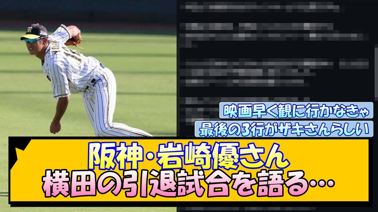 阪神岩崎すぐさん横田の引退時合を語る。 自分はみんなとは離れバックスリーン横から見ていました。イニング途中というみんなが注目する場面の中らしさ溢れる全力失走で守備 1 に向かいました。全身がジ員とする感覚を覚えてます。変わっていきなり打球が飛んできました。センターオーバーの [音楽] 2 塁打でした。守備機会があって良かったなと。 そう思いました。すると次打車センター前ヒット。このプレイについてはもう語る必要はないでしょう。その前のセンターオーバーで打球処理ができてよかったなとそう思った自分を今でも公開しています。 [音楽] [音楽] [音楽] 岩崎横田のことを思い出すことがあるかと聞かれることがありますが思い出しません。 [音楽] 思い続けているからです。これまでもこれからもです。 最後の3 量がザキさんらしくてめちゃくちゃ好きやわ。 本当に心がこもった文章にはどんな言葉のうまいかけても叶わないんよな。 ザキさんがインスタで横田さんのこと書いてて泣ける。 思い続けているから思い出さないって最高の表現だよな。 [音楽] 胸が熱くなる文章映画早く見に行かなきゃってなった。 見るのが逆に怖いと思ってたけど、これ見たら行くべきだなって思えた。 岩崎さんのインスタほんまに良すぎるんやわ。これからも何の面白いすれを取り上げていくのでコメント、チャンネル登録、高評価よろしくお願いします。 [音楽] [音楽]