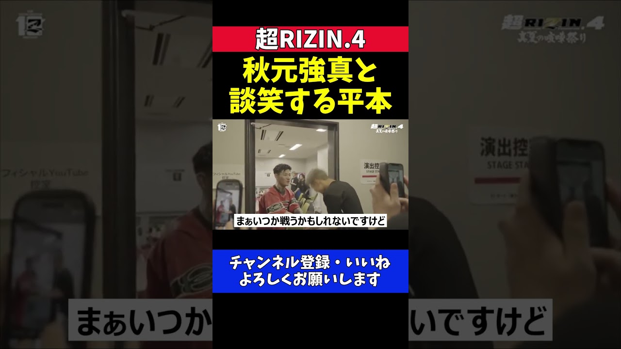 「超RIZIN.4」控室での一幕。秋元強真が平本蓮のもとへ挨拶に訪れ、2人は談笑。平本は「複雑な関係」としながらも、秋元の才能を「マジで天才」と称賛。今後の対戦をほのめかす場面も。
