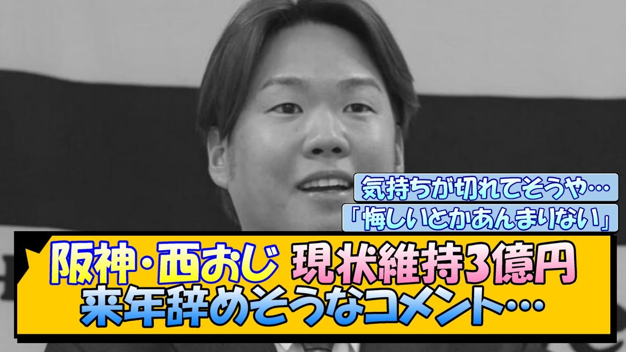 阪神西おじ現状 3億円来年やめそうなコメント 西悔しいっていうのはあんまりないですね。いい経験だったなって。 トータルで見ると18から35 までよくやってきたんじゃないかな。 西勇きが現状維持の3億円で契約公開。 23 年から4 年契約で来期が契約の最終年となる。 なんか来年終わったら成績に関わらずスパットやめそう。気持ちが切れてるんかな?って心配になるようなコメントやな。 この言い方来年で引退かもしれんな。 なんか引退しそうなコメントなんやが必要な存在やで。 このまま終わっていって欲しくない選手なんやけど、あかんのかな。 本人の気持ちが切れてるってことはないと思いたいけど、それに近い状況なのかもね。 投球スタイル的にもまだまだ長く現役やって欲しいで。 これからも何の面白いすれを取り上げて いくのでコメント、チャンネル登録、高 評価よろしくお願いします。