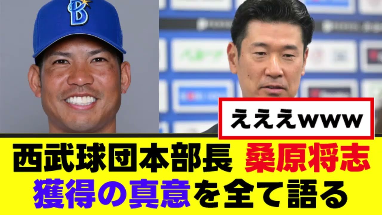 西武弘池球団本部長原正幸獲得の意を全て語る。 25 日、埼玉西武ライオンズが DNAからFA 権を行使していた桑原正幸選手の衝撃獲得を発表した。これに対して西武の弘池団本部長がその位を全て語ったとして話題となっている。弘池さんは桑原選手の力が必要と訴えてきた。その熱意が伝わった結果意に至ったで取った選手を育てて優勝していくのが理想。 しかし成長スピードを上げる意味では競争 がキーワード。実績のある選手が入ること で成長を促したい。強くなるスピードを 上げたいのが獲得の狙い。咲夜桑原選手 から電話で入団の石を頂いた。条件はお 伝えしない。誠意はことごくした。動か ないといけない状態に来た。成功しか見て いないが公開するなら動いて公開したかっ たと語った。これに対してネット上では 様々な声が上がっている。 やっぱ夏暑い屋外球場より冷房の聞いた快適なドーム球場でプレイしたかったんやろな。セリーグ 5球団は結構嬉しいんじゃね? 今までの貢献にはもちろん感謝してるけど、この遺跡は結構いい気分しないですよ。 パテレが喜んでそう。 そうか。そうか。そんなにチュニドラをA クラスにしたいのか。 来年は桑原のキツネダンス13 回見れます。 これハマファンぶち切れだろ。 南マチャンネルは現在動画編集者を募集しています。 興味のある方は動画概要にあるメール アドレスにご連絡ください。