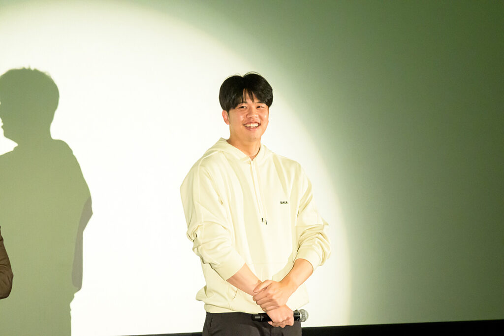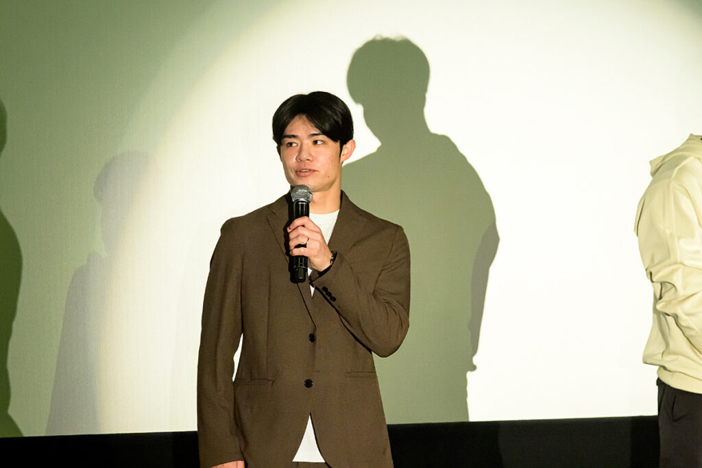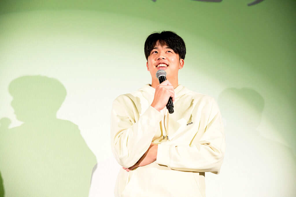 大きな拍手に迎えられて中野選手と才木投手が登場し、優勝パレードをはじめ、イベント続きの中野選手は「だいぶ疲れてますね」と本音を明かしつつ、「こんなに近い距離で皆さんにお会いできるので、楽しみにしてきました」、才木投手は「映画館で舞台挨拶させてもらうことはあまりないので、楽しみにしてました」と言い、「観てもらったら分かると思いますが、服装の温度差がすごいと思います。綺麗目の服装で来てくださいと言われたので、綺麗なパーカーで来ました(笑)」と場内を沸かせました。