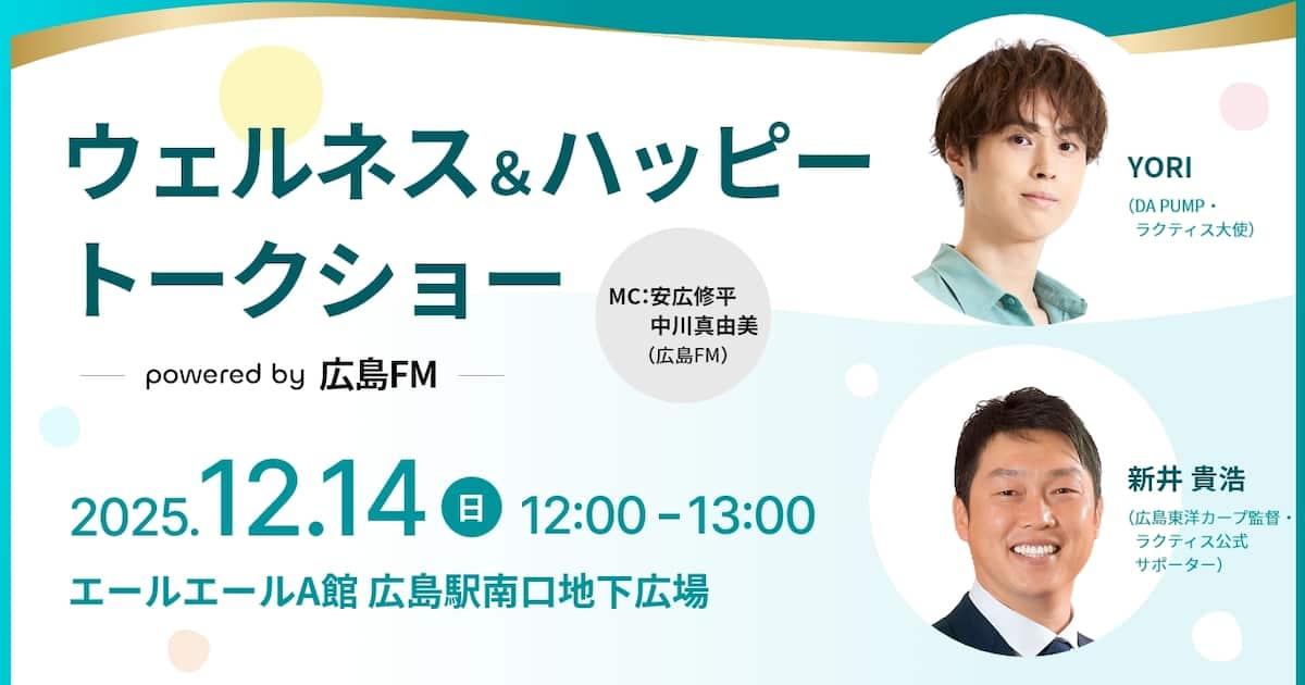 トークショーでは、広島出身の2人が「ウェルネス&ハッピー」をテーマに、スポーツや音楽、そして日々の健康づくりを通して、楽しく前向きに毎日を過ごすヒントをお届けします。トークショーの模様は後日、広島FM「Mash The Radio」で放送されます。