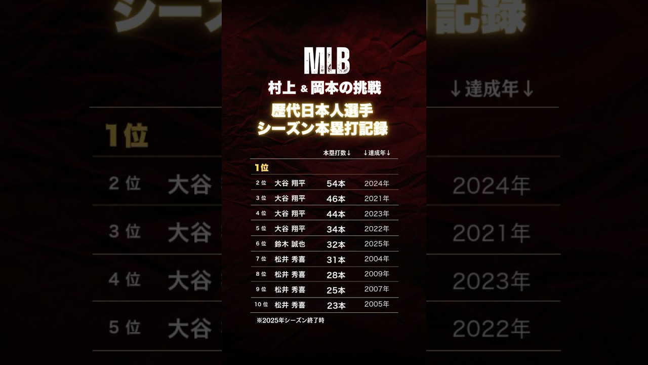 【MLB2026村上宗隆&岡本和真の挑戦】日本人選手シーズン本塁打トップ10 MLB2026シーズンに村上宗隆&岡本和真が参戦! 日本人スターが挑戦してきたMLB舞台でのシーズン本塁打トップ10を振り返り! 大谷翔平、鈴木誠也、レジェンド松井秀喜は?! いつか超える日を願って応援します!! mlbNPBTokyo Yakult Swallowsシーズン記録ホームラン村上宗隆東京ヤクルトスワローズ NPBHUB.COM | The Fanbase of Nippon Baseball & Nippon Professional Baseball