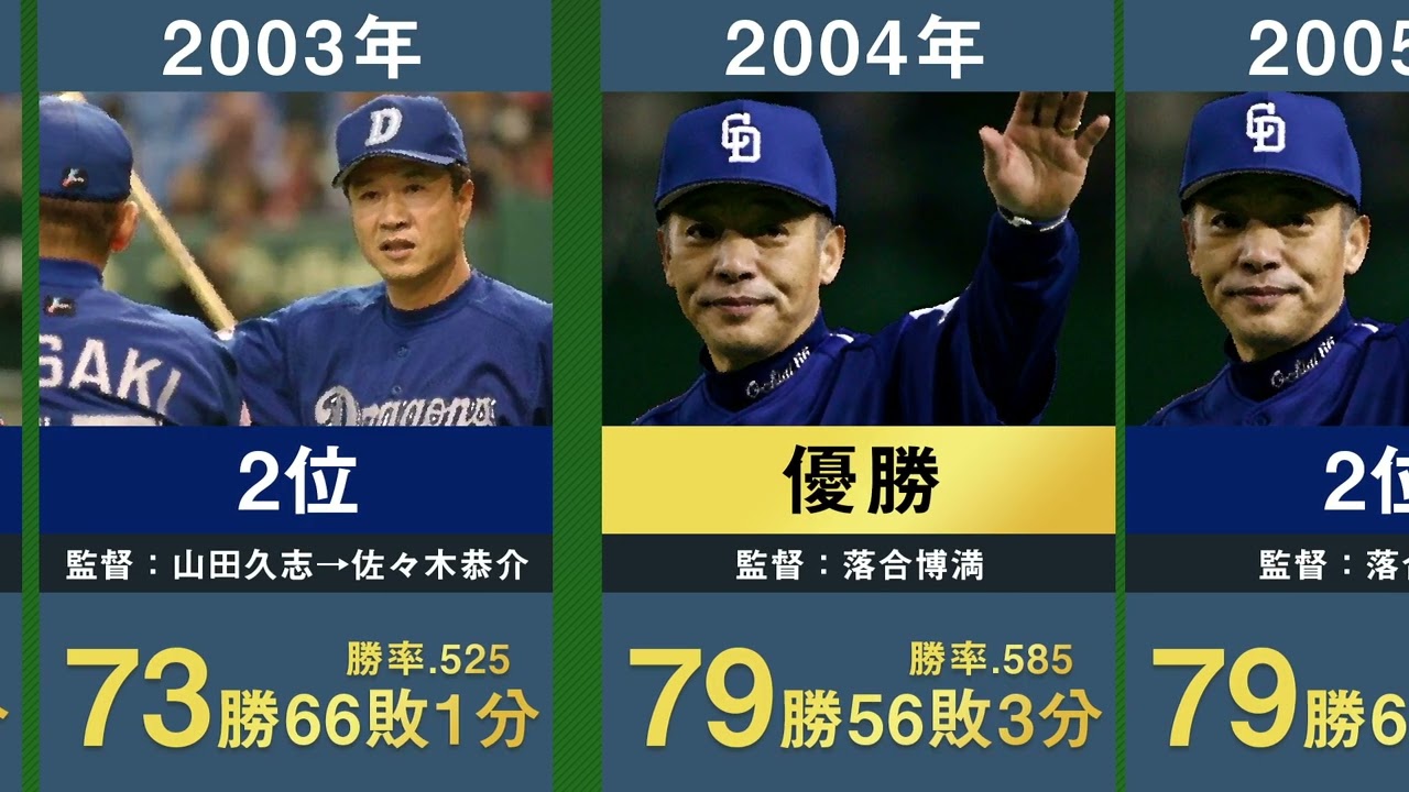 【ホームランウイング設置へ】中日ドラゴンズ歴代43年分の年度別成績と順位を並べてみた【プロ野球 井上一樹 立浪和義 与田剛 森繁和 谷繁元信 高木守道 落合博満 星野仙一】
