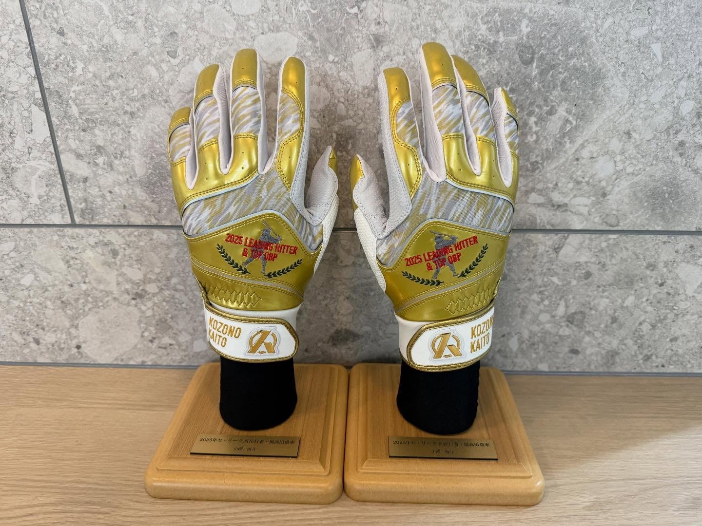 広島東洋カープの小園海斗が、首位打者と最高出塁率のタイトル獲得を記念した特製の手袋を公開した。
