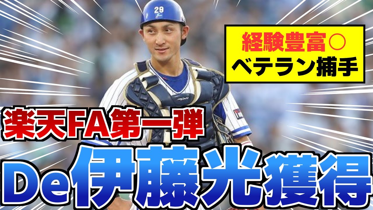こんにちは。わしみんです。今回はついに 楽天に5年ぶりのFA選手が来てくれたと いうことで、DNA伊藤軽星の獲得報道に ついて見ていきたいと思います。前回の 動画で4人のFA選手を紹介しましたが、 ECGMの発言的に今年の獲得はないかな と思っていたところだったので、今回の 獲得報道はかなりサプライズだったのでは ないでしょうか。なんか今年は結構 しっかり補強してくれそうな感じで嬉しい ですね。是非最後までご覧ください。 ということで、まずは伊藤選手の プロフィールから見ていきましょう。伊藤 選手は愛知県出身の現在36歳で高校は 名得技塾を経て2007年ドラフトで オリックスから3位指名を受けて黒入りし ました。オリックス時代は岡田監督から 将来の正候候補として期待され徐々に投格 を表すと2014年にはベスト9 ゴールデングラブ賞加えて金子千ひ投手と の最優秀はテリー賞を受賞する活躍を見せ ました。その後2018年にDNA トレードで移籍してからも経験豊富な 通れる星として主に他の選手と併用という 形で出場を重ねていきますが、ここ2年は 山本選手や松尾選手が対当してきた煽りを 受けて昨年は39試合、今年は6試合の 一軍出場にとまっていました。今回のFA では出場機会を求めてMLBを含めた球団 とも交渉していたということで、そんな中 でイーグルスを選んでくれたのはファンと しては嬉しいところです。 今期の成績ということで見ていきましょう 。先日の通り今年の伊藤選手は一分出場 こそ少なかったもののイースタンでは75 試合に出場して打率3割輪ということで しっかり結果を出していました。広角に 打ち分ける打撃で主に即急を弾き返し出塁 率は3割8部3便の高い数字を残しつつ WRCグラスは140に迫る数字といずれ も一定の水準に立ちることがわかります。 個人的には今の楽天主人でこの成績より 明確に上と言える選手は今年一軍で結果を 出した堀内選手ぐらいかと思っているので 、来年の伊藤選手に関しては一軍で出場 機会を得られる可能性が高いと思ってい ますし、めちゃくちゃうまくいけば正 みたいな感じになるパターンもあるのかも しれません。 まとめということで来の伊藤選手に期待 する活躍を見ていきましょう。伊藤選手の 加入で現在の支配保守になりました。今期 主に出場機会を得たのは西保守の太田選手 に加えて今期一気に対当した堀選手、石原 選手といずれも20代半ば後半のいわゆる 中堅どころの保守だったのでウテランの 伊藤選手の加入はバランス的にも良い選択 だったのではと思いますし、枚数が増えた ことで安田選手を1塁やDHで起用する パターンも取りやすくなったのではと思い ますね。現在の伊藤選手の受列としては おそらく第2、第3星ぐらいだと思います が、今回結んだのは勝負の断年契約という ことで、春先からガンガン試合に出てオフ には高年を勝ち取るくらいの活躍が見たい と思いますね。ということで今回は以上 です。ご視聴ありがとうございました。 [音楽]