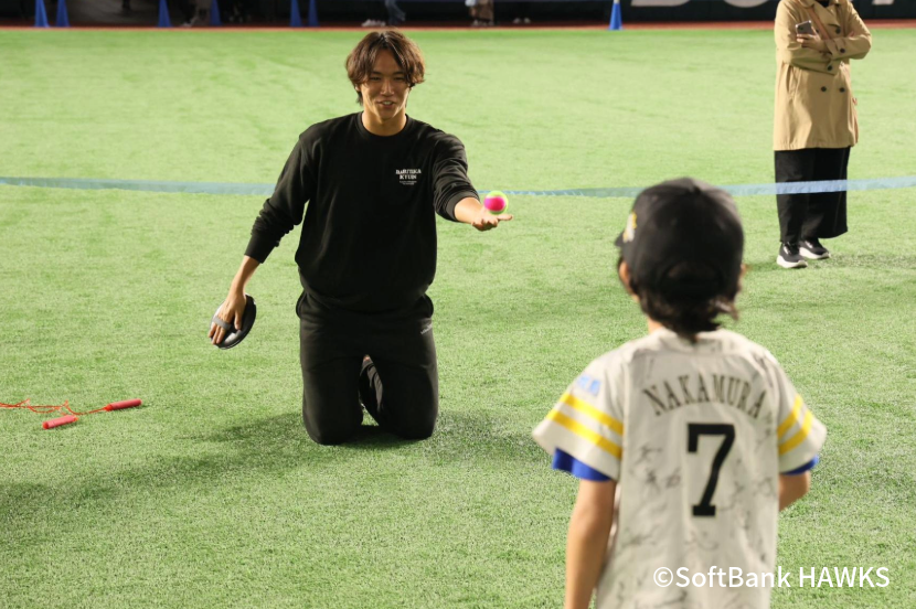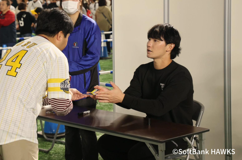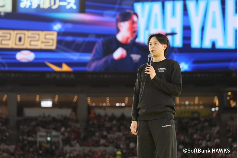 イベントの締めくくりとして行われたファイナルセレモニーでは、栗原陵矢選手がファンに向けてあいさつを行いました。栗原選手は来シーズンから新たに選手会長を務めることを自ら発表し、「まだまだ自分の成績も出せていない状況ですが、周東会長が在任していたときにリーグ連覇したので、その良い流れに乗っていけるように、来年まず1年間頑張っていきたいと思います」と力強く決意を語り、スタンドのファンから温かい拍手が送られました。