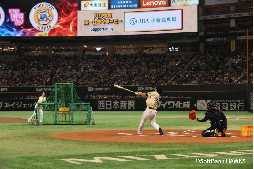 目玉企画の一つ「バリタカ ホームランダービー supported by JRA 小倉競馬場」には、「めんたいRockers」から秋広優人選手、助っ人・山川穂高選手、「とんこつSparks」から笹川吉康選手、助っ人・野村勇選手が出場しました。ルールは、各チーム5分間で何本の本塁打を打てるかを競うのですが、助っ人の打席中にランダムでCANDY TUNEの楽曲『倍倍FIGHT!』が流れ、その間にホームランを打つと得点が2倍になるという特別ルールも。