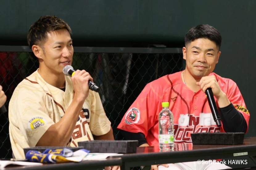 試合が動いたのは3回。「とんこつSparks」の3番手投手、山本恵大選手から川村友斗選手、松本裕樹投手の安打でチャンスを作ると、渡邉陸選手の打球の間に「めんたいRockers」が1点を先制しました。しかしその裏、クローザーとして投入した周東佑京選手から、杉山一樹投手が右中間への2塁打を放つと、代走の木村光投手が盗塁を決めて3塁へ進塁。ここで大津亮介投手がタイムリーヒットを放ち「とんこつSparks」が同点に追いつきます。「めんたいRockers」は投手が本職の上茶谷投手に交代しますが、岩井俊介投手、イヒネイツア選手に連打を許し、「とんこつSparks」の逆転サヨナラ勝利で幕を閉じました。