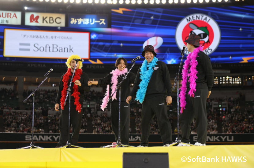 最初の企画「バリタカ ヒットスタジオ」は、歌うま対決からスタート。一番手として登場したのは「めんたいRockers」の秋広優人選手なんですが、カツラにサングラス、あごヒゲ、ともしかして松山千春さんのモノマネ!? 客席からもどよめきと笑いが起こります。ところが、秋広選手がいざ歌い始めると、想像以上の美声。客席からも「こんな声してたの!?」「めっちゃ上手い!」と驚きの声が次々と上がっていました。これに対して、「とんこつSparks」からは今年ドラフト1位で入団した村上泰斗投手。カラオケが特技ということを証明するかのように、自慢の声を響かせていました。野球場では絶対に見られないであろう姿に、他の選手もどんなパフォーマンスを見せてくれるのか楽しみで仕方がありません。