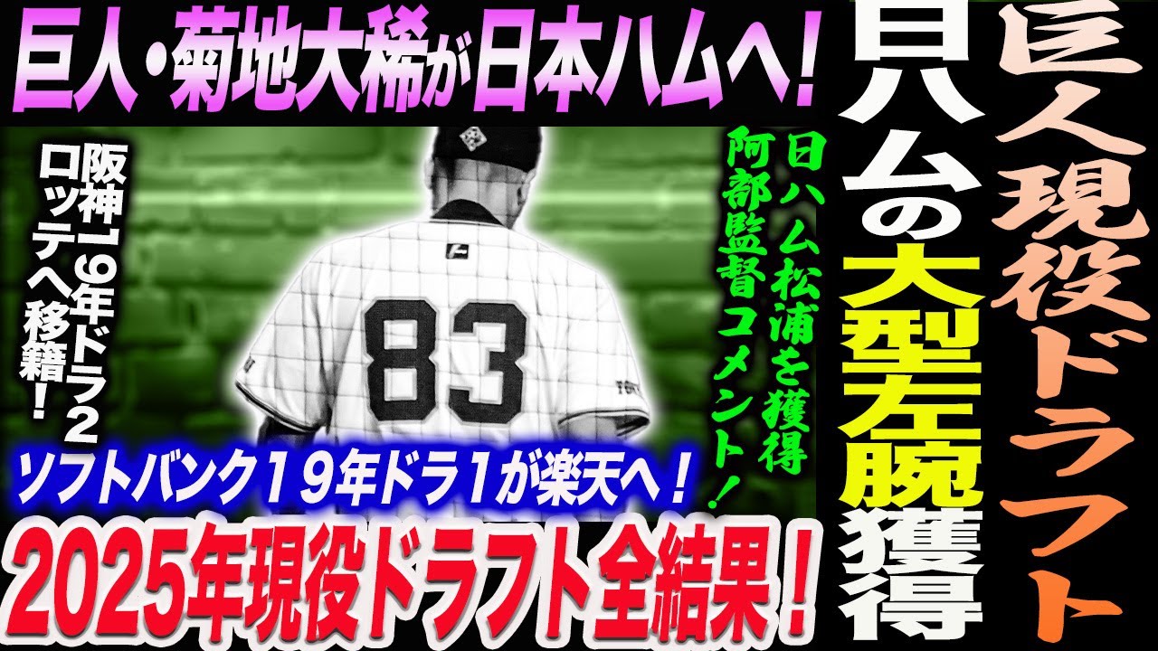 2025年現役ドラフト全結果考察!巨人は日ハムの大型左腕獲得!菊地大稀が日本ハムへ !阿部監督コメント!ソフトバンク19年ドラ1が楽天へ!読売巨人軍 ジャイアンツ 巨人 GIANTS 阿部監督