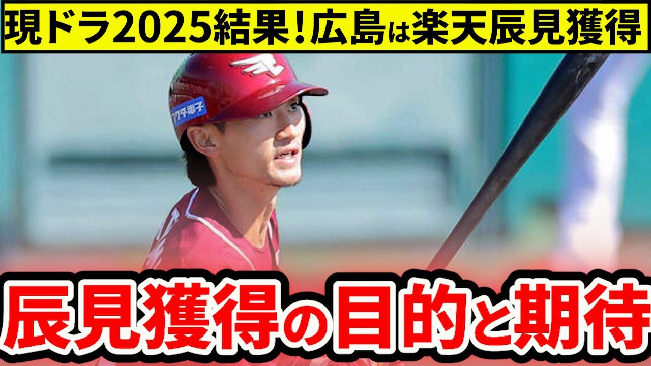 カブスキ系チャンネル はどうもカプスキンです。今回は2025 年の現役ドラフトの結果振り返っていき たいと思います。12月9日に現役 ドラフトが行われました。カープはですね 、楽天から辰選手を獲得したという結果に なっております。で、一方でカープから 移籍することになったのが大道投手という ことで、こちらは2年連続ヤクルトに移籍 するという形になっております。で、多球 団のね、ところも全体的に見ていきますと 、例年ほどのサプライズみたいなところは ね、あまりなかったのかなというようには ね、思います。ま、日が獲得した菊投手 だったり、巨人が獲得したね、松浦投手は あんま評価がね、高かったんじゃないかな というところは予想されたりはね、え、 するんですが、ま、全体的に元々ね、予想 されていたような選手から、ま、大きく 外れたといったチーム選手はいなかったの かなという風にね、思っております。ま、 ソフトバンクの佐藤選手とかはね、ま、 意外いっちゃ意外かもしれませんけど、 ソフトバンクはね、例年、え、こういうね 、ある程度成績も残してる選手も出して、 まさに現役ドラフトの趣旨の通りね、 武球団に行けばもっと出られるっていう 選手出してるので、ま、外の選手といった ところはね、ありましたが、ま、全体的に はインパクトが大きいものはなかったのか なとは思います。え、というわけで今回は ですね、ま、カープの中でね、辰選手の ですね、期待ポイントをね、しっかりと まとめて、で、この辰選手の獲得でチーム 内ね、どういったことが起こるのかをね、 考察しましたので、是非最後までお 付き合いください。え、またこの チャンネルの登録、まだの方は登録も よろしくお願いいたします。それでは内容 に参りましょう。ではまず辰之助選手の プロフィールおさいです。出身地福岡県 でして176cm67km右投げ右打ちの 選手です。青南学院大学から楽天で 2022年の育成1位で指名されており ます。で、今回カープに移籍するという ことになりました。ポジションとしまして はセカンドやサードガイアを今年は守って います。で、2025年今年ですね、1 軍上がなし。ま、視界化登録はね、されて 1軍えのチャンスもあったんですけど、 結局出場はなかったというようなシーズン となっております。え、一方で2軍の方で はですね、イースタンリーグの通るように 輝いたといったところで、ま、これからも ね、分かるように瞬速がですね、持ち味の 選手となっております。で、総力はね、 本当に低評がありまして、ま、ゲームの中 ではね、S総力Sという評価をね、受ける ほどのね、え、足の持ち主ということに なっております。期待するとことしてはね 、ダイソの切札としての一軍入りかなと いうように思いますので、ま、その辺りね 、しっかりと成績をね、確認しながら見て いければと思います。では、辰選手の成績 見ていきたいと思います。今年は1軍での 出場がなかったということですので2軍で のね成績のみにはなってきます。2軍では 88試合に出場して189打席打率は2割 8部OBS6割2部7輪という成績です。 で、注目したいところがですね、盗塁が 31、盗塁失敗が5つということで、ま、 2軍の盗塁をだけではなくてですね、この 成功率86.1%といったところがね、 非常にね、圧と言いますか、素晴らしいな と思います。ま、盗塁ね、数多いっていう 選手でも成功率低いとあんまりね、意味が ないんですが、辰選手の場合はしっかりと 成功率も高い。え、それで言ってね、企画 数もね、そもそも多くて積極的に仕掛けて で成功させる力があるということで、ま、 これはもうね、え、他の選手に劣らない一 という風に考えていいのかなと思います。 もうとトップレベル、1軍でも通用する レベルのね、え、盗塁技術総力があるん じゃないかなということもね、考えられ ます。で、一方でバッティングは、ま、 正直やっぱまだまだ課題はあるかなと思い ます。ま、2軍で2割8部はね、打って ますけど、OPSはね、ちょっとまだ 低かったり6割2部7輪ですし、ま、長打 もあんまりなかったりするところで、 BB%も5.3%と高いわけではなくて、 K%15.9%というね、アプローチも、 え、めちゃくちゃいいというわけではあり ませんので、そこは改善する必要があるか なとは思います。ま、ただまだ年齢的にも ね、え、25歳というとこで伸び代といっ た点もね、考えられますので、そこは どんどんね、伸ばしていってもらいたいと 思います。ま、体の線がまだ細いといった ところはね、コメントにもあったので、 そういったところも、え、しっかりと成長 してですね、長打もですね、打てるように なってくればいいのかなと思います。ま、 ただ現時点でもね、すでに足という武器を 浮かして生かしてね、ダイソ要因としての 一軍器用といったところもね、できると 思いますし、ま、どちらかというとね、 そこをね、考えられての獲得になったのか なというように思