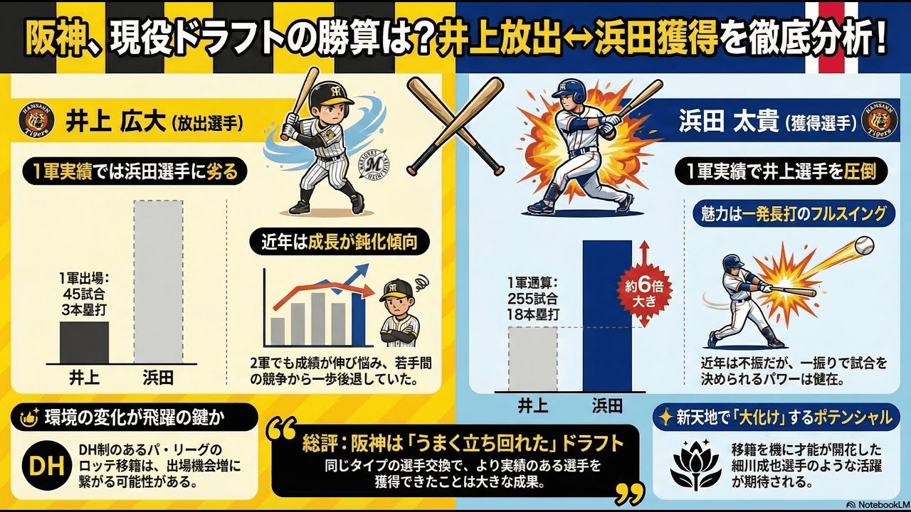 はい、今回は本日行われた現役ドラフトに ついて、え、ま、話していこうと思います 。ま、ということで阪神は結論からいくと 井上孝太選手が、え、ロッテに指名されて いまして、で、阪神が獲得した選手は ヤクルトの、え、浜田選手だったという ことでも同じく右の、ま、外野手、ま、 強打の、え、スラッカー系の外野、ま、 入れ替えになったという形になりました。 ま、去年も阪神は右投資を出して右投資を 獲得していたりだとかで、ま、同じような ね、流れになっていて、ま、今年は現役 トラフト全体として外野種がうん、結構 ですね、こう入れ替わりが激しかったって いうところになっていて、ま、阪神もうん 、その仲間に入ったという形なんですけど 、ま、ただ結論としては僕はこの現役 トラフト阪神視点で見ると、ま、現時点で は、ま、間違いなくあのうまくいった、 あの、うまく立ち回れたような現役 トラフトになったと。ま、これはもちろん なんというか全てがをあの予測して、え、 リストも提出したわけでないと思いますし 、結果論的な部分もありますが、ま、でも 現役トラフトでまずシンプルに考えていく 上では、ま、そのトレードを申し込んだ時 に成立するのかどうかっていうのがその 球団視点で見た時の成功か失敗かの分岐点 になるかと思うんですけど、ま、阪神視点 で見ていくと、ま、浜田選手と井上選手と 同じ右の、え、大砲系の選手ですけど、ま 、トレードが成立するラインかって言うと 、ま、成 しにくい、ま、阪神の方が断れる可能性が 高いような、ま、入れ替わりなんじゃない かというのは誰が見ても思うところだと 思います。というのは、ま、浜田選手は、 え、1軍通さん、え、255試合、666 打席でホームランも18本打ってる選手 です。ま、井谷選手よりも1つ年上では ありますけど、ま、ほぼ変わらないぐらい の年代で、え、これだけの数字残ってて、 で、井上選手は1軍では45試合だったり 、111打席だったり、ま、3本だったり と、ま、大体浜田選手の方が6倍1軍での 実績があるんですよね。なので、ま、相当 、ま、相当と言うとあれですけど、どちら もレギュラーは取り切れてない選手なので 、えー、ま、相当ということはないんです けど、ま、でも上の選手であることは 間違いないのかなっていう風に思います。 あの、ま、僕は阪神ファンですけど、ま、 ヤクルトの浜田選手もちろんあの、知っ てる選手だし、ま、大体のリーグ見てる方 は、ま、浜田選手って名前は聞いたことが ある人が多いんじゃないかなと思います。 ま、とにかくパワーが魅力の選手で 思いきりのいい、ま、フルスイングが魅力 の選手で、ま、よくね、え、代打とかでは 近年は出ていることが多かったか、ま、 今年に関しては、え、9月とか10月は 結構1軍でもね、試合出ていた浜田選手な んですけど、ま、代打とからね、出てこ られると、ま、1振りでスタンド1で持っ ていくだけのスイングっていうのをしてる 選手なので、すごい怖い選手ではあったん ですよね。うん。なので、ま、阪神ファン の僕からしても、ま、井上選手をもちろん めちゃくちゃ阪神ファンから期待かけられ た選手だし、特に阪神がものすごく2軍で 打席数を1年目から与えまくって、ま、 こう成長させようとなんとかこう主力にさ せようとしてかなりあの育成リソースを 咲いてうん、育ててきた選手ではあります ので、ま、阪神としてもね、苦十重の決断 というか、ま、安せやすと手放せる選手で はなかったんですけど、ただそれで、ま、 浜田選手が取れるのであれば、ま、これは うまくいったというか、ま、井選手を出し てでも、あの、取るべきうん、選手だった のかなっていう風には思います。ま、 チーム編成としては同じ右のスラッガー系 の選手なので、ま、大きくは変わらない ですね。で、ちょっとこれあの昔のになっ てしまってて、ま、まだドラフトとか反映 してないし、ま、戦力になってる選手も いるんですけど、変わってみた時には、ま 、井上選手はね、今期レフトが開いていた と、あの、誰も定まっていなかった中で、 ま、正直1軍にほとんど上がりすらして なかったし、ま、スタメンでも出れなかっ たんですよね。中選手とか中川選手、前川 選手の工人を排す形になってしまって、ま 、特に前川選手に、ま、負けてしまってい たってのは昨年からもそうでしたけど、 高寺中川っていうこの2人にも追い抜かれ てしまったっていうところが、ま、井谷 選手はチーム内の立ち位置が大きく変わっ た今シーズンになってしまっていたし、ま 、昨年は2軍主体ではありましたけど、2 軍であのいい成績、明らかに向上させた 成績を残していて、今年ね、あのステップ アップしなければならなかったのは高選手 とか中川選手以上に農選手だったはずなん ですけど、まあ、1軍の舞隊ではその2人 に追い抜かれ、ま、そして2軍でも、ま、 成績がね、また逆戻りしてしまったという 、ま、打率