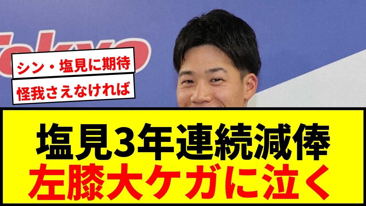 [音楽] 3年連続憲法 左下ライに泣くヤクルトの塩みた 32外契約公開交渉に望み 3 年連続の年ダウンでサインしました。今期は開幕直前に左膝全十字体の手術を受け一軍復興は本拠地最終のみでした。塩み選手はし立たないと現法を受け入れつも 2 年間のリハビリを前向きに捉えています。 9 年目となる来は山新監督の下で完全復活を誓いみとして宮場に戻ることを目指します。 [音楽] 12球団ナンバーエ1 センターはしみなのか金本なのかで分のファ争っててが美しいな。 潮みって1 億言ってないんだよね。活躍できたシーズンも短いし。 本人も分かっているようだし方ないよね。 2年連続怪我で不効果なかったんだから。 プロ野球選手として最も油乗った時期に 3年連続で故障で先制立つ。 いくら素晴らしい選手だとしても怪我して試合に出られないのなら意味がない。ここ 3 年の低名は山田鉄や村上の不長よりもしみがいないことが痛かった気がする。 千みって若いのかと思ってらもう 32 年やね。大谷の世代よりも一個上なのか。 怪我されなければて一体何年言われ続けるのだろう。たらればの話になってしまうがしみがもしに強く [音楽] 1年間働ける身体だったら特に1 億円プレイヤーになっていてもおかしくなかったな。 本当にヤクルトの選手って多いよな。それもまあまあ重賞というね。みはos [音楽] の1 年目の時も膝の大怪我をやっていて膝の大画は 3回目。 フルトの人のは人工芝の影響なのかな。 ダスのエースの穴 だ [音楽]