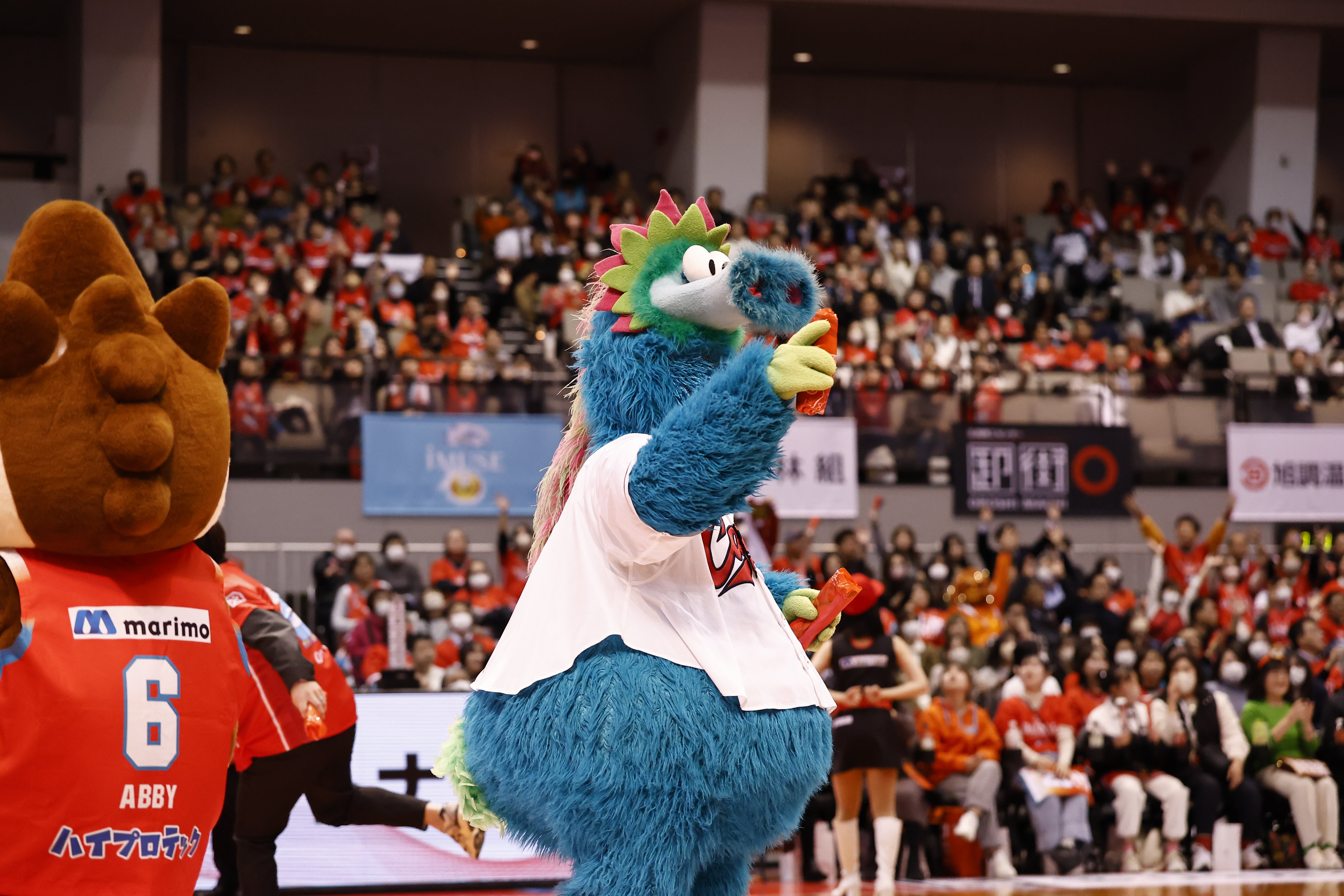 第4Qオフィシャルタイムアウトでは、「Abby’s Challenge」を実施いたしました。今節のチャレンジはカープコラボDAY開催を記念して、スラィリーと一緒に”二人三脚でラン&シュートチャレンジ”を実施しました。アビィとスラィリーのチャレンジが成功か失敗かを選んでご応募いただいた方の中から、抽選で1名様にアビィぬいぐるみがプレゼントされました。