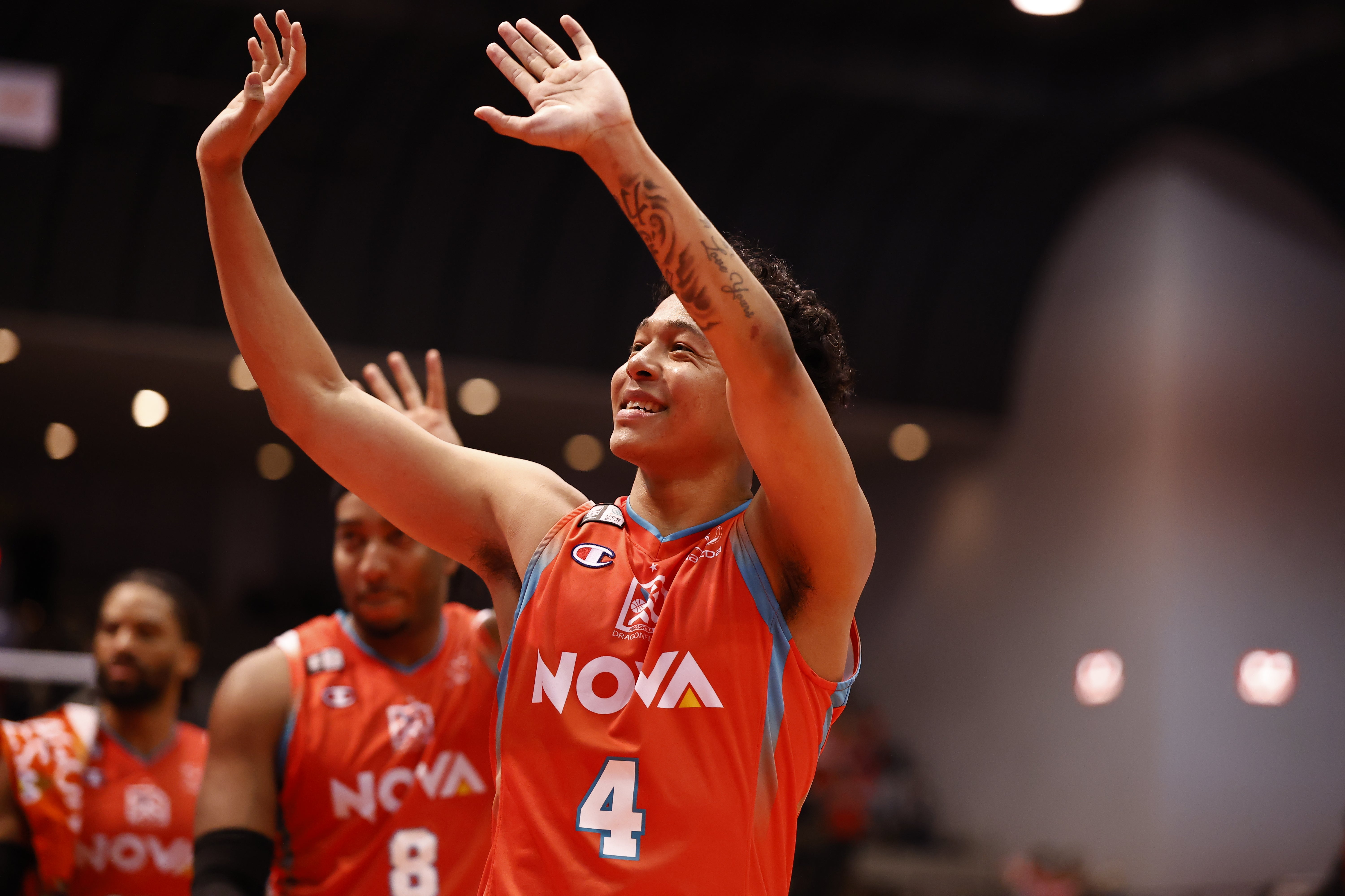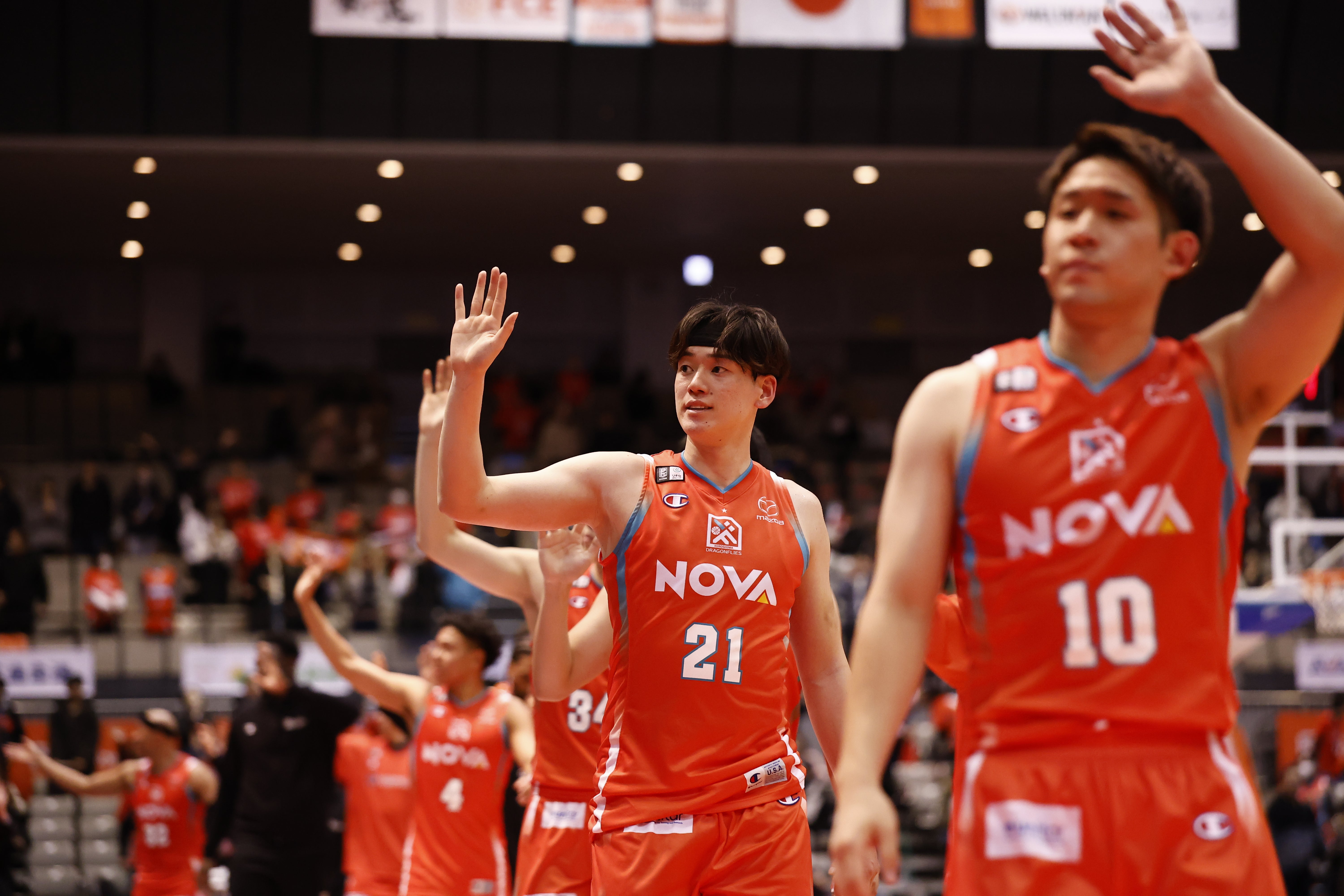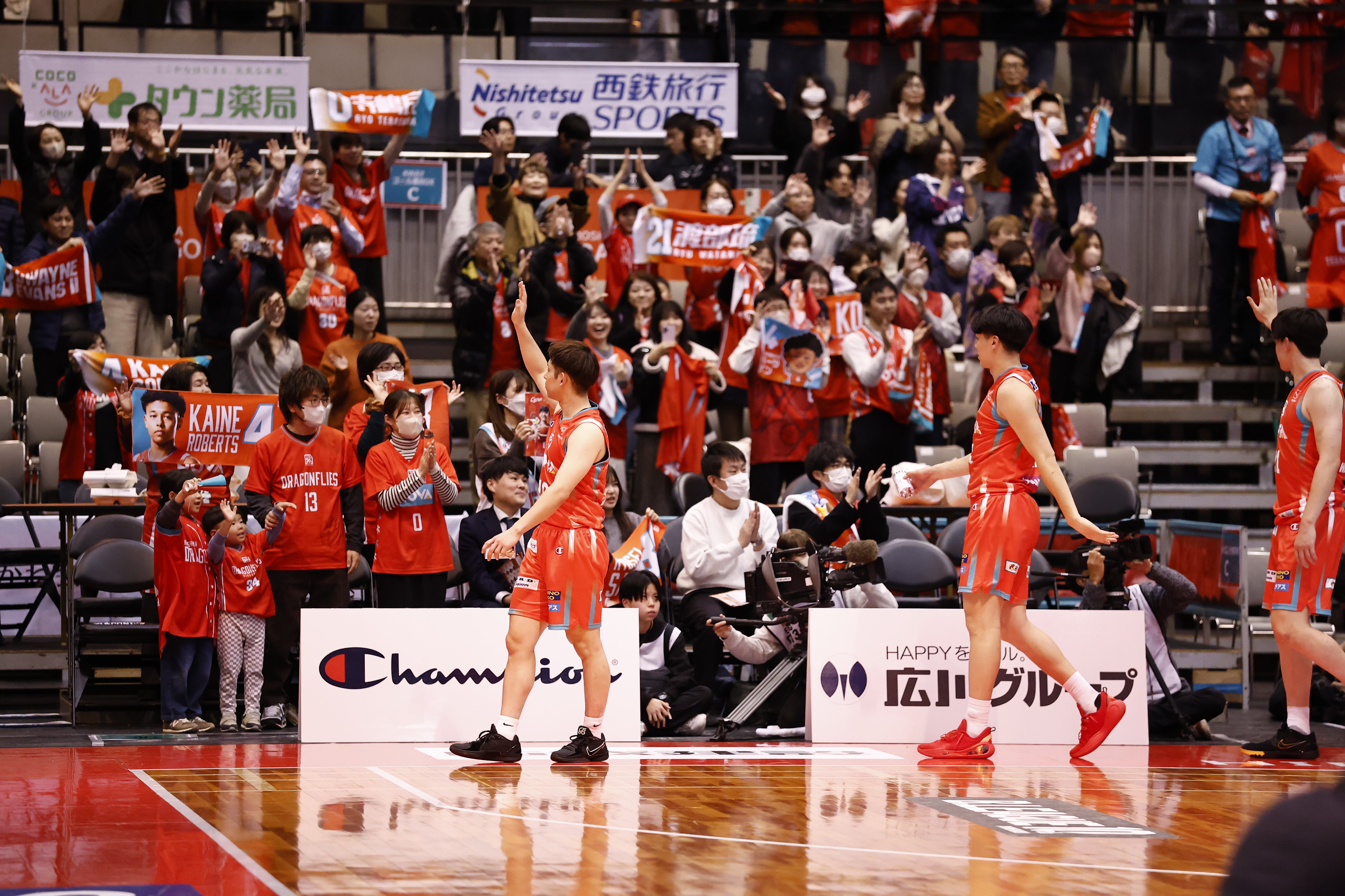 広島ドラゴンフライズは、熱い戦いを繰り広げてくれたアウェイチームへリスペクトを込めて、スタンディングオベーションでお送りしています。
