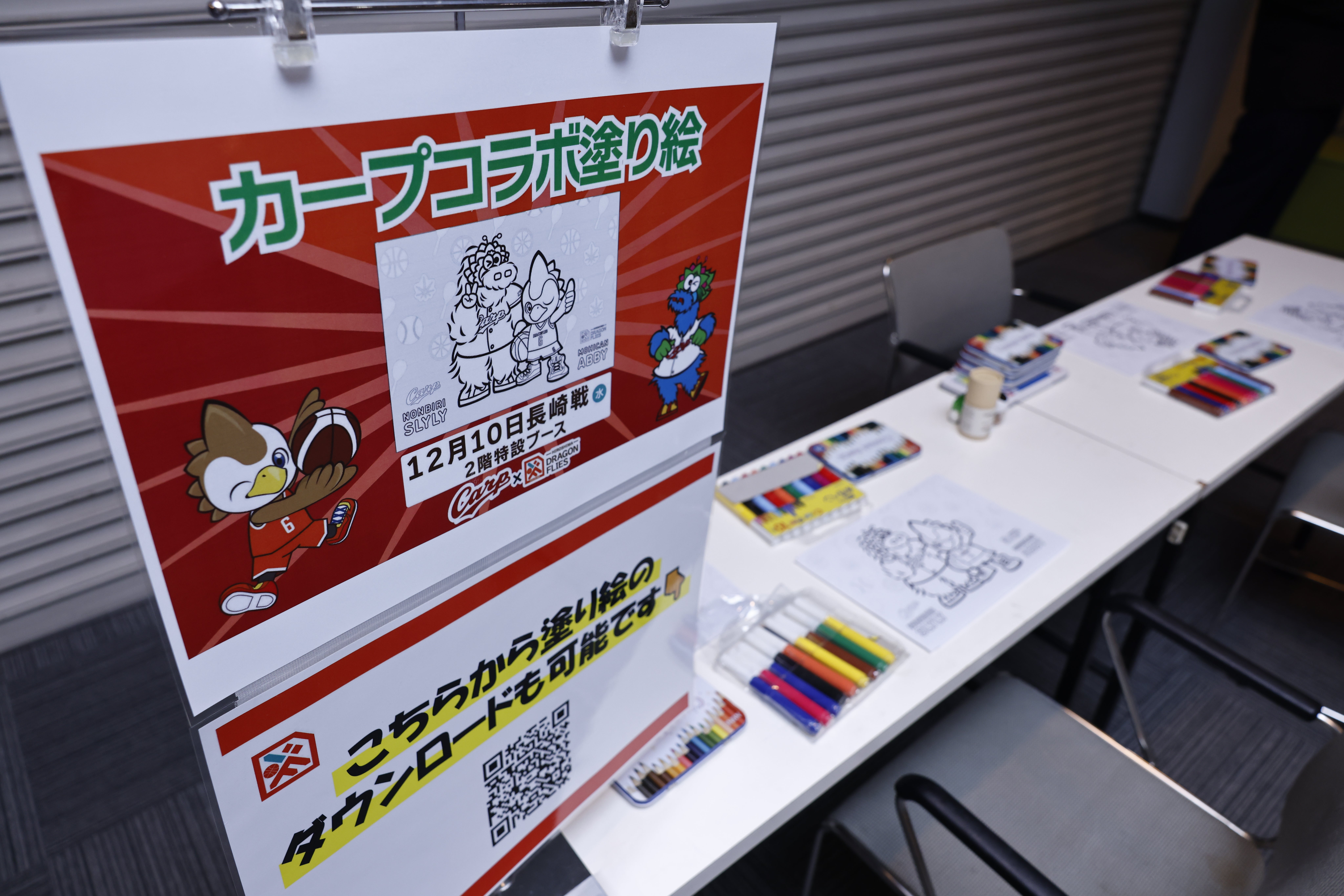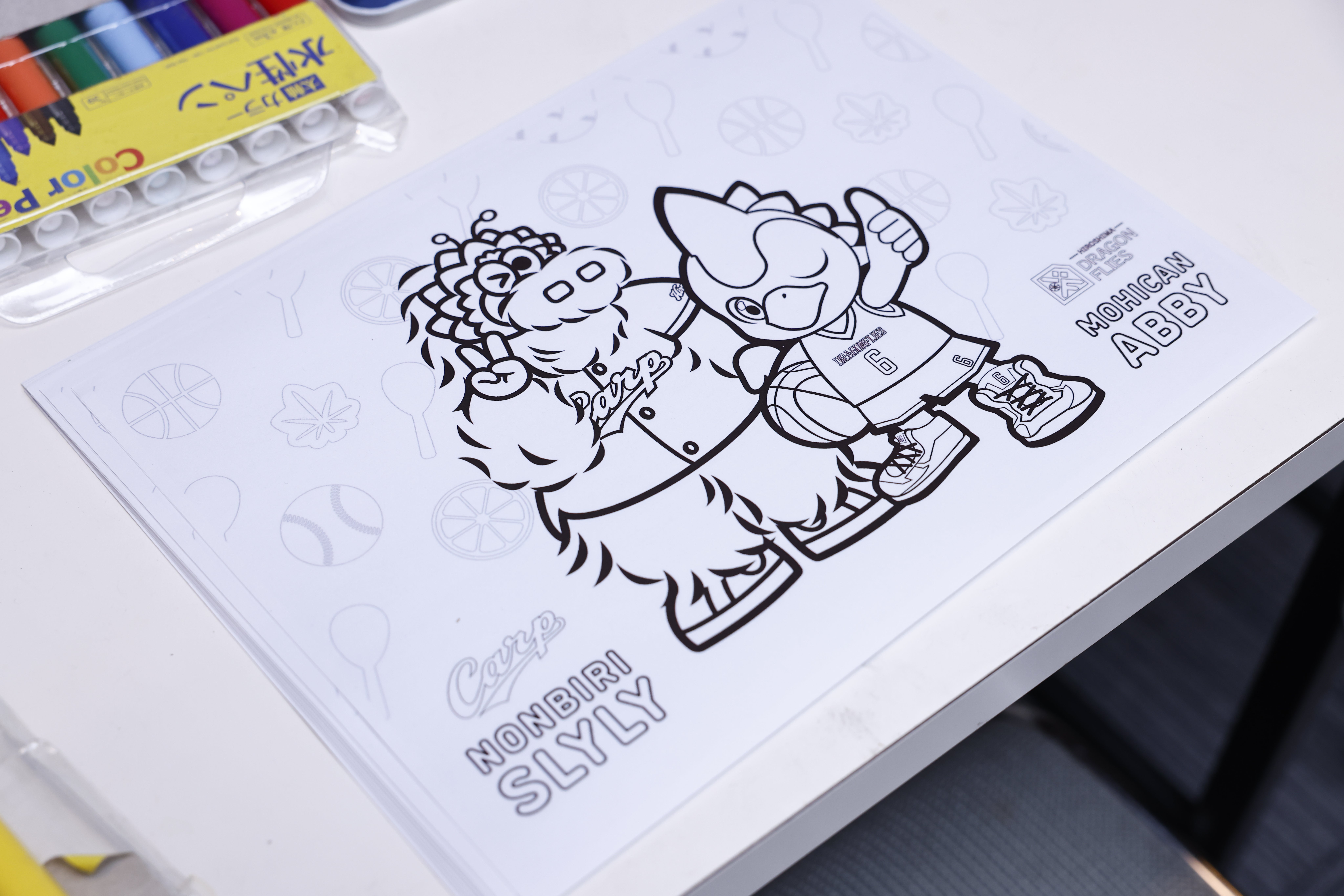 カープコラボDAY開催を記念して、スラィリーとモヒカンアビィがコラボした塗り絵を書いてもらうブースを設置いたしました。