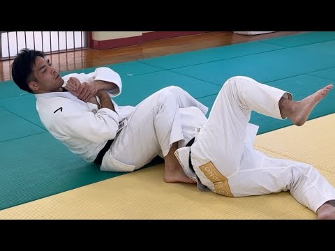 なった。踏ん張られたからこっちにって十字行きますとか。なかなか難しいんだけど相手をこう引っ張ってこれるぐらいまでも あの後で動画見返して使えるようになったタイミングでやってもらえれば多分生きてくると思うんで覚えてください。じゃ、引き続き今度は関節技いきます。 で、えっと、十字型固め、腕十字、え、腕十字片目かな?正式名称がやろうと思います。どんな技買う?分かる人?分かるよね?これは分かるね。い、 分かるね。 はい。1 番簡単なってかみんなが知ってる 関節技かな? 分かるよね?なんとなくこんな形です。 はい。 じゃあ、ちょっと、えっと、基本形を見せようと思います。あ、ちょっと青向けになるんで、もっと寄ってもらっても、あの、分かりやすいように見えやすいところにいね。いいよ。 はい。ま、右左どっちでもいいんですけど 、え、腕十字固めっていうのは基本の形は こう相手の上に 足を持ってきて、この取りたい腕を 自分の足でまたで挟む。で、 相手の腕を持って相手の肘関節を決める 関節技になります。で、これもね、ま、締 と違って落ちたりと気絶したりとかしない けど、あの、ほっとくと腕折れるんで。 折れるし、ジ体切れたり脱球したりと結構 とんでもない怪に繋がるんで、あの、練習 の時はゆっくり決めるようにこんな バーンって決めたりとかしないように ゆっくりね、 あの、相手を痛めつけるための柔道じゃ ないんで、技術を、え、試し合う、お互い に高め合う場所なんで、怪我をさせるん じゃなくて、ちゃんと相手が安全に配慮し てゆっくり決 っていうのをやってください。これが基本 の十字の形です。で、 どうしようかな。ちょっと角度変えていい ですか?こっち。 ま、基本の形だけ1回やってもらおうかな 。青、片方が青向けになって、 えっと、相手の足を腕を挟んで しっかり腕を抱えてゆっくり倒れる で決めるていうのが十字が、この形を じゃあ1回2人組でやってください。で、 決まりそう、決まってからじゃなくて 決まりそうになったらもうタップ。相手の 足をタップする。まいった大きい声で言う 。 怪我をしないようにしっかり安全に配慮して 2 人組でやってください。ふざけてバーンって取ったりしない。相手を怪我させないのも柔道なんで。分かった。 はい。 じゃあ2人組でやってみましょう。 で、ま、今確認してもらったのは、ま、決め方とかは言ってないんでとにかく相手との位置関係ね、相手が横たわってて不明の人がこう相手の足を挟んでご両で持ってるっていうのがなんとなくこうやって決める。 でもな、どこも決めどことかをやって なければこれでも決まんないです。 こうこうなってたりとかね。こうなって たりとかね。決まんないです。 どうやって決めるかって言うと、僕は十字 大事なポイントが、え、3つかな?3つ あると思ってます。1つ目は相手の肩、腕 の付け根脇と自分の、え、お尻との距離。 これが離れてると、離れてると関節決め たくても 僕が決めてるのは前腕になってます、今。 これはどんなに引っ張っても決まんない です。浅いからしっかりとこの距離を埋め て欲しい。 相手の肩の後ろに自分のお尻がくっつく ぐらいしっかり相手と密着してください。 それがなかなか難しいと思うんだけど僕は それを相手の襟りとか持って襟りとか同技 とか持ってしっかりこうくっつくようにし てます。ま、なんか ちょっと締め技っぽいなって思う人はいる かもしれないですけど、締め技じゃなくて 相手とのこの距離を詰めるためにぎゅって こう寄せてます。で、寄せたところで手で こう寄せたところで今度は 足でもグってこう なんか水する時に水かきしたりするでしょ 。ひにくって描いたりとかする。そんな 感じでくって寄せる。設定するてすると、 ま、ちょっとは相密着できる。相手が 例えば、え、エビとかをしようとしてここ の方に向いてきた時、体を回転させて こようとしても、ちょっとこっち向いて もらっていいですか? こう入ったとこう寄ってるから回転でき ない。これがないと相手は肘を抜きながら 狂って回転できたりします。こうすると 決められなかったりするんで、取れなかっ たりするんで、そうならないように しっかりと、ま、最初はこう引き寄せる。 引き寄せたなって思ったらかで寄せる。 寄せる。ここでくっついた状態を作って あげる。次はこれが1個目。相手の脇とか 腕との腕と僕のお尻の距離をキュって 詰めること。もう1つは相手の取り手を しっかり挟む。 この股をしっかり閉じてこの腕、ま、 ちょっとさっきのあの相手が逃げないよう に肘を抜かれないようにするに近いんです けど挟む。 なかなかね、慣れてないとこの挟む力って いうのはなかなか難しいんだけど相手を こう引っ張ってこれるぐらい 引っ張ってこれるぐらいしっかり挟んで ください。これが多分いきなりは無理です 。練習しないと。多分最初弱いから 引っ張れずにこうずるっとなると思うんだ 