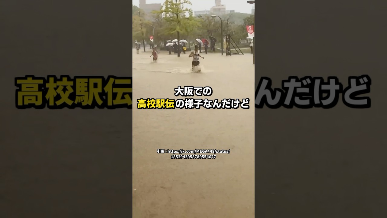 この映像を見てこれは先日行われた大阪で の高校駅伝の様子なんだけどこの日の天候 は超大荒れ途中からコースは水溜まり どころではないレベルで水没し溝を かき分けてなんとか前に進む選手の様子が SNSで話題になりましたこれを見た視聴 者からはなんで延期にしないんだ運営の 判断ミスっていう批判の声も結構来ててま ただ行動を使って多くのスタッフを動かし て開催している分なかなかすぐ中止合延期 っていう判断もできなかったんだと思い ます最終的にレースは続行困難ということ で中止になり11月5日に途中の4区から 再開するという判断になったそうも とにかくこの1日のために調整を重ねてき た選手たちが報われる結果になってほしい ですね