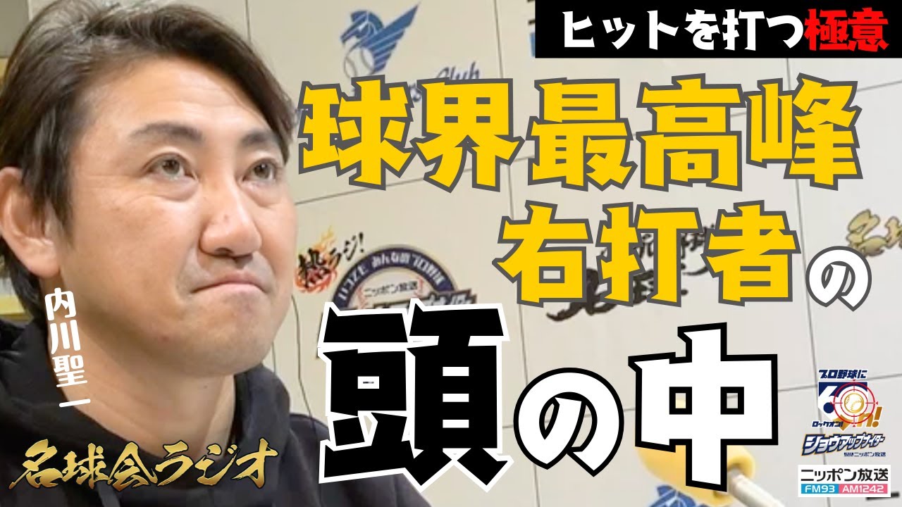日本放送アップナイター 60周年明宮会 明宮会内川誠一さんをゲストにお迎えしています。さて、現役時代はセパ両リーグで周打者に輝きまして打率立 3割が通算8回。シーズン150 アダ以上も通算8 回記録している内川さんです。続いてはこちらを伺ってみましょう。 アンダ製造機内 誠一さんに聞くヒットを打つ極内 さんは現役時代あんなにポンポンと なぜ振ればあのよく打ち出の小槌と言い ますがヒットを量産することができたのか 最近3割打車も 減てますけども内川さんにヒットを打つ 極意について伺いますが1つはこの3割が かなり難しくなりつつあるって今の 現状どんな風に見てますかやはり こうピッチャーのこう平均があったり とか自分自身を知るっていう形っていうのが色々僕増えてきてると思うんですよ。例えばこう動作解析であったりだとか、ま、トレーニングの部分であったりだとか、ま、栄養の部分でもそうですけども、技術の部分でもそうですし、メカニックの部分でもレベルがすごく上がってきてると思うんですよね。自分自身のパフォーマンスを出すっていうのはまずピッチャーが先じゃないですか。 はい。はい。まずボールを投げるっていうところの自分が手になって投げれますから現のメカニックの部分が上がってきた恩恵をまず受けられるのがピッチャーなのかなって気がするんですよ。そこは景急速だったりこう変化の綺麗であったり回転とかね、いろんなとこありますからバッターとしてはそれをこういかに打つのかっていう受け身の状態なのでそこがバッターのが追いついてないのかなっていう感じはしてますけどね。 うん。 確かにピッチャーはね、あの、自分手動だから指をこう何度にかけるとか力の入れ方とか そのままやればいいけどバッターはそれに対してそれをやっぱり打たなきゃいけないのでだそこがちょっと難しくなってる部分はあるのかなっていう気はしてますけどね。 なるほど。内川さんと言うと 3割7部8輪っていうこれが 右出した最高。 え、この数字が僕はパッと思い浮かぶんですけど、あの時お話伺った時にボールのが大きく見えて あ、ありましたね。 ソフトボールって普通言うんですけど、バレーボールっていった記憶があるんですよね。 本当年間2打席ぐらいですかね。 本当に不思議な経験なんですけども、ボールがピッチャから離れて自分の方に向かってくる時に大きくなったんですよね。で、大きいボールだと打つの簡単じゃないですか?どうやってバット入れたら打てるのかっていうところが感じたことがあったんですけど、その打席が続いてくれたらもっと簡単なのになと思ったんですけど、 2打席ぐらいしかなかったですね。 そう。さん終わりな8 輪の時に打席にはい。2打席ですね。 その後は その後はないす。 だからもうこれはなんかこう自分だけの問題ではないのかなって気がするんですよね。選手っていうのは毎合ベストな状態でっていうとこ目指してやりますから頑張ろうっていう気持ちだけでもダメですし本シリーズのホームランそうですけど熱い部分と冷静な部分とっていうところのま、バランスがうまく取れた時にそういう現象が起こる可能性はあるかなって勝手に思ってますけどね。 あ、よくね、あの、縫い目が見えるとか表現がありましたがバレーボールっていうのがね、私すごく残ってるんですがね。バッティングで言うと数字で見るとファーボールも少ないし三振も少ないタイプだったと思うんですが、その辺りは意識されてた。うん。やっぱりバッターっていうのは追い込まれば不利になるっていう風に僕は思ってたんですよね。なので自分自身がこう狙ったボールであったりだとかバットがしっかり触れるっていうコースに来た時は僕はバット出していくべきだっていう風に思ってたんですよ。 どちらかというと、こうデータであったりだとか相手の傾向っていうことよりも自分自身がどういう風に考えてどこのボールをどうやって打つのかっていうのを決めて入った後はそれに従うだけだっていう風に思ってましたからだからおそらく積極的にも打ちに行きましたしカウントで いかに勝負をつけるのかっていうところはすごく考えてましたね。 ま、あとはやっぱり広角に打つというイメージセンターから右ですね。こちらの数も多かったですけどこの辺ははい。 そうですね。 右バッターっていうのはボールを長く見た方がストライクボールの見極めもできますし、今みたいに打球の角度とか飛距離とかっていうとこは僕は全く求めてなかったんですよ。さっきのヒットを打つ極意は何だって言われたら僕は人にいないとこに打つのが 1番いいと思ってるんで。 だからバッティングって相手から来るボールっていうところが、ま、入社角だとしたらバットでどう反射角をつけるかだと思うんですよ。 なので、ま、12 塁打ちたいんだったらバットの面を 12 塁に向ければそっち自然と飛んでいきますし、センター打つんだったらバ