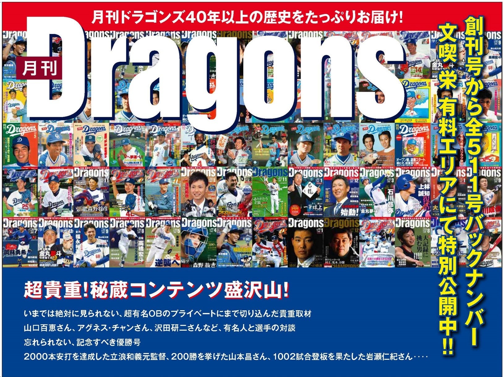 大喫茶ホール(有料エリア)内「読居 嘴広鸛(ハシビロコウ)」にて、1983年(昭和58年)の創刊号から最新号まで「月刊ドラゴンズ」全511号を実際に手にとってお楽しみいただけます。