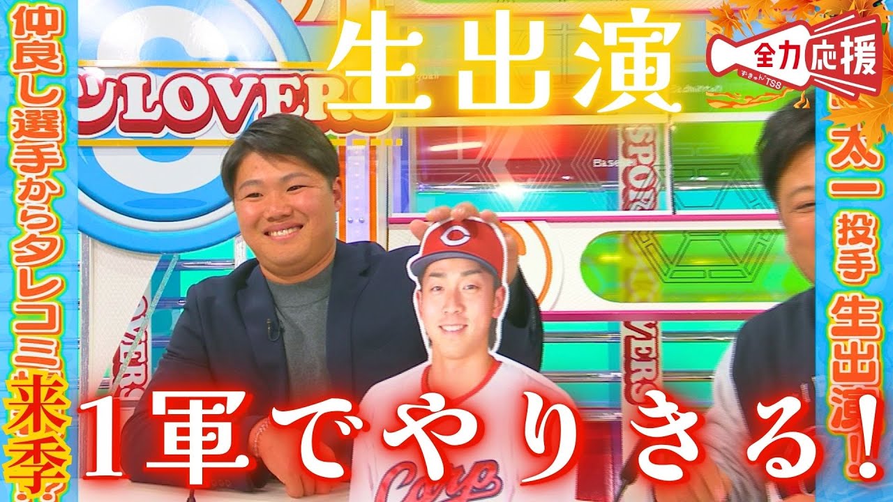 [音楽] こんばんは。 全力応援スポーツラバーズです。今日のスポラバもスペシャルゲストと一緒にお届けしていきます。 広島東洋カープた高太一投手です。 ようこそ。 ようこそ。 こそお願いします。 よろしくお願いします。 てくれました。 はい。今シーズンもお疲れ様でした。 さあ、 今はどうですか?ゆっくりできてますか? いや、まあでもずっと練習練習で トレーニングは実まらないようにはい。しかし おすごい。 はい。高投手といえば前回スポラバに来ていただいた時常ひ投手と 2 人で来ていただいたんですがあ、これ、これ、これ、これ。 はい。 あ、初めてくれたね。そうだ。 今日はお1人ということでかですか? そうですね、あの、ちょっと緊張していて うん。 はい。 ま、ちょっと日本語と所々忘れそうなんですけど、緊張してください。 安心してください。 高投 なんと なんと 末ひ投手 ご用意いたしました。 ああ、 それではい。 はい。だけ 喜んでる たか。頑張ろうな。 すいません。え、ごめんなさい。ごめんなさい。ごめんなさい。これはちょっとやりすぎました私は。 はい。今日は高投手にはミニ常ひ投手と一緒に番組最後までお付き合いただきます。 はい。 ではこれから高投手にたっぷりとお話伺っていきます。まずは今シーズン一緒に振り返ってきましょう。 背番号22 太ルーキアーの昨シーズンプロ初登板を果たし迎えた [拍手] 2025年。春のキャンプから [拍手] 7月までは2 軍生活。来るべき時に備え検を積む時間が続きました。 [拍手] そして8月1日、ついに今期初の 1 軍到登落。その日のドラゴンズ戦でプロ初の先発マウンドを任されます。 6回を投げわずか1 失点。打線の援護もあり、嬉しいプロ初勝利を手にしました。 [拍手] え、ま、2 軍暮らしが長くて、え、チームに全く貢献できてない中だったので、え、こういう風に、え、少しずつ結果を残していければなと思ってます。 こちらお願2 軍で積み重ねてきたことが形として実った瞬間でした。 [音楽] 8月21 日のベイスターズ戦ではこんなシーンも記念すべき初ヒット。 [拍手] 投げ手は事故最長隊となる 7回のマウンドへ。協力打線相手に 2失点と試合を作り、今期 2勝目をマークしました。 まさか打てると思ってなかったんで、あ、狙い済ましました。はい。 シーズン終盤まで先発ローテーション勝に入り 3勝2敗。プロとしてステップアップの1 年を過ごした高手にこの後たっぷりとお話を伺います。はい。ということで今シーズンギュっと振り返ってきましたが改めてどんな 1年でしたか? そうですね、ま、最後の方はああいう風に一軍で、え、ローテーション回ることができて、ま、良かったなっていう気持ちと、ま、やっぱり最初から 1年間1 軍にい続けたいっていう気持ち両方 うん。 こう両方出たシーズンでした。 そうですよね。ま、キャンプと開幕とね、 2 軍のスタートでしたけども、焦りはなかったんですか? いや、もう危でしかないですね。もう 危 まずもう見ても もらってすらないと思ってたんで ああ、キャンプもね、選ばれてなかったです。 そうですね。ま、まず見てもらえるとこに行かないといけないっていう、 ま、焦りはすごいありました。え、 そしてプロ初勝利かがでしたか? いや、もうすごいたくさんのファンの うん。 うん。 前で投げることができて、で勝つことがさらにできて うん。本当最高の日になりました。 最高ですよね。 はい。そんな初づしの 1 年だったと思うんですが、さらに振り返るためにこちらのコーナー参りましょう。高投手がスタシオ 7 解説に挑戦。あの劇闘を振り返ります。見たか聞いたか高の生解説高の [音楽] 29名勝負プレイバック。 はい。 ということで、今シーズンの高の登板を振り返る上で、特に印象深いと言っても過言ではないであろう 8月21日のベイスターズ戦 宮宮崎選手との20級に及ぶ1 打席の勝負について高投手ご本人に解説していただきます。 ってみましょう。早速どん行ってみましょうかね。 VTRどうぞ。 はい。この日はね、序盤からって 5対0 とね、リードしてる中でね、玉数も少なく行ってて、宮崎選手の打席の前で 63 球ペースでしたけども、カ封意識してました。 そう。あ、ま、そこまで うん。 深くはでも考えてなかった。 うん。でもこれもね、早めに追いつんで 3 球目もね、ま、勝負に行ったのかなっていう感じですけど。 はい。あの、やっぱりこの試合までにかなり中継の方投げていたんで、 ま、できるだけ最後まで行きたいなっていう気持ちではありました。うん。 うん。 ここでね、初めてこれストレートを投げるんですけどね、 はい。 ファウルでね、 これが7球目。 これ7球目。 初球ね、カットボールストライク通ったん。これ見極められましたよね。 そうですね。自分としてはそのコース高さ悪くないとこに投げたつもりだったんですけど、あそこを見逃された時にだいぶ当てますね。これそしてこのファウル、これでしょ。 [音楽] どうですか?ストレ