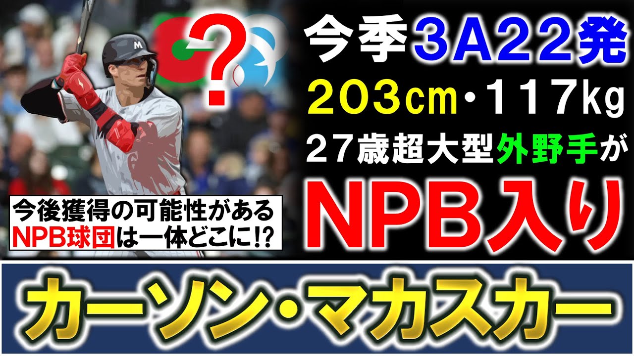 はい、プレイボールどうもです。今期 トリプレA22発23cm117km27 歳大型外野種がNPB入りカーソン マカスカーということでございましてはい 、まあ今回はシスケット野種のねお話で ございます。ま、その中でもこのカーソン 任すかメジャー経験はね、ほとんどなく 主にトリプレイでプレイしてる選手では ありますが、ま、とにかくね、体格って いうのが大きく身体能力も高いという ところではありまして、ま、結構荒いん ですけど天井も高そうな大型外野種、ま、 彼がどうやらこうNPBにね、来るんじゃ ないかというところになっておりまして、 ま、一体どの球団に行くんだろうっていう ところも含めて、ま、色々お話していき たいと思いますが、まずはネキ時から チェックしていきましょう。 はい。ツインズのカーソンマガスカーが NPB入れ。新たなスケットが海を渡る ようだ。ツインズは10日。カーソン マガスカー会社をリリースと発表。 アメリカ遺跡オートメディアMLB トレードルーマーズによると具体的な国や 球団名などの詳細は明らかになっていない もののアジャアでのプレイを予定している という。NPBか韓国プレヤー級KBOで 会感を目指すことになりそうだ。28歳の マカスカーは大学卒業時はノラフト使名さ れず21円と22年は独立リーグでプレイ したクローニだ。23年6月にツ日の マイナー契約を結ぶとさっきダブルAトプ AでK123者勝し打率2割8分219 本塁打点841をマーク今期はトリプレA の106試合で打率2割4622本 リーダーを記録5月にはメジャーデビを 果たしたメジャーでは16試合で打率1分 2レホリーダー1者点オフィス0点372 と結果を残さずMLBトレードルマーズも 少ないサブル数ながら印象的なものでは なかったと指摘する。それでもマイナーで はK1146スキ打率26部5輪率3割3 部分5輪打率4割94人WRC+119を マークした気約を目指すライ高メミディア は2026年の大半をマイナーで過ごす ことになっていたと占う。ツインズはガヤ に有力選手が多く28歳大砲候補の立場は 決して安泰ではない。それゆえアジアで 不証計を目指すことは自然な流れだった。 MLBトレードルーマーズはマガスカは おそらく現在よりも怖な年保障と自分の 実力をアピールするための定期的な視聴系 を確保できるでしょう。もし新天地成功を 納めることができればそれを足掛かりにし て北米野球への復帰やタリーグでの さらなるチャンスにつなげることができる かもしれませんと大きな決算のを見守って いるということでおります。というわけで 、ま、ツインズがね、カーソンマカスカー をアジア駅のためにリリースという情報が 先日出ておりまして、ま、NPBなのか KBOなのかというところもありましたが 、ま、どうやらね、その話を追っていくと これNPBじゃないかというところまで 明らかになってきておりますんで、ま、 まだ確定ではないんですけど、ま、KBO ではなく、ま、こっちに来るんじゃないか というところが言われております。ま、で はそんな任すかではありますが、どういう 選手が成績かっていうところしっかりと見 ていきましょう。 はい、では見ていきます。カーソン マガスカ2023年アマチFAで メルビ入り出身中はアメリカ1998年5 月22日まで27歳203cm113km まとにかくね大柄な選手でございまして ポジションはガイア右投げ右打ちマカスカ は大学2年時にブラーズにドラフト指名さ れておりましたがそこでは契約せず 引き続き大学9回でプレイを続けており ましたが卒業中のドラフトでは指名モ森と なりエコはアメリカ独立をフロンティア リーグでプレイしそこで抜群の設計を残し て2023年6月にツインスをマイナー 契約してMLB入りさらに2年目となる 昨年は早くもトリプレAまで昇格し、まず の成績を残すと今期は5月にMLB発勝格 を果たし16者に勝となっておりましたが 結果を残すことはできなかったということ になっております。はい。ま、この カーソン任すか。大学試合はね一度こう指 示されていたんですけど結局卒業時にはね 指名されずにアメリカ独立性プレイでま、 そこで結果を出してツインズとマイナー 契約でそっから今年ねデビューまで掴んで いたクロニというところでありました。で 、ま、そんなね、マカすか42枠に入って いたんですけど、ま、12月の10日に 自由契約アメリカメディアによるとアジア 遺跡のためにリリースされたというところ ではありまして、ま、通常ね、こういう時 は遺跡とかそういうところもかかるんです けど、ま、それもなく、ま、ツインズを枠 を開けたいのと、ま、ガスカーがね、いい 契約取れそうっていうところでリリースし たんじゃないかというところも言われて おります。で、そういったのが今回ね、 KBOではなくNPB球団と契約なんじゃ ないかという話が出ておりまして、ま、 どこかしらね、NPB球団に来るんじゃ ないかという話になっております。で、ま 、そんな任つかどういう成績を残している かっていうのも確認していきましょう。 はい。じゃあ成績見ていきましょう。まず 