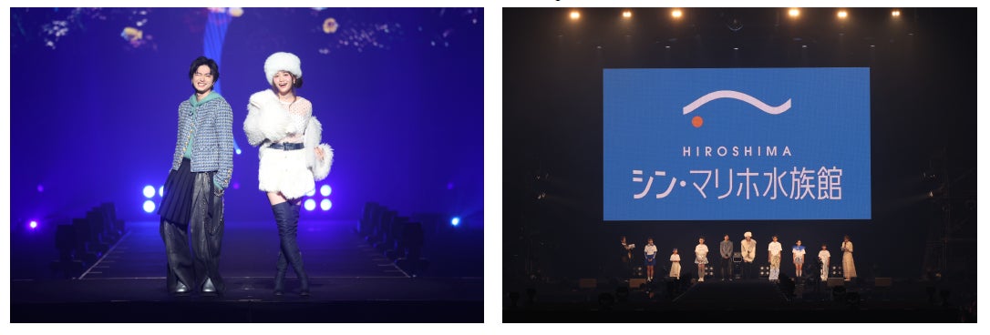 広島をはじめ全国各地で、水族館や商業施設、レジャー事業を幅広く展開するみどりグループによるスペシャルステージ。昨年末惜しまれつつ閉館した「マリホ水族館」が、新業態「シン・マリホ水族館」として12月2日(火)にアルパークにオープンしたことを記念した特別ステージです。ランウェイには、みどりグループのCMイメージキャラクターを務める広島県出身の塚本恋乃葉と、広島を舞台にした映画『惑星ラブソング』で主演を務め、同映画で塚本恋乃葉と共演した曽田陵介が登場。トークパートでは「地元・広島でのTGCは特別感がありました。」と笑顔を見せる塚本恋乃葉に、5年ぶりのTGC出演となった曽田陵介は「4年間、大学生活を過ごした広島でのTGCというのはもちろんですが、前回出演したときはコロナ禍で無観客だったこともあり、皆さんの声にニヤケちゃいそうでした。」と、ランウェイを歩いた感想を。続けて、塚本恋乃葉は「解放的で魚の種類も多くて心が癒される空間。広島の渓流を再現した水槽が一番印象的でした!」と “シン・マリホ水族館の魅力”を語りました。さらに、シン・マリホ水族館を盛り上げる親善大使もステージに登場し、それぞれの視点でおすすめポイントを紹介。水族館へ行きたくなるようなワクワク感あふれるステージを届けました。