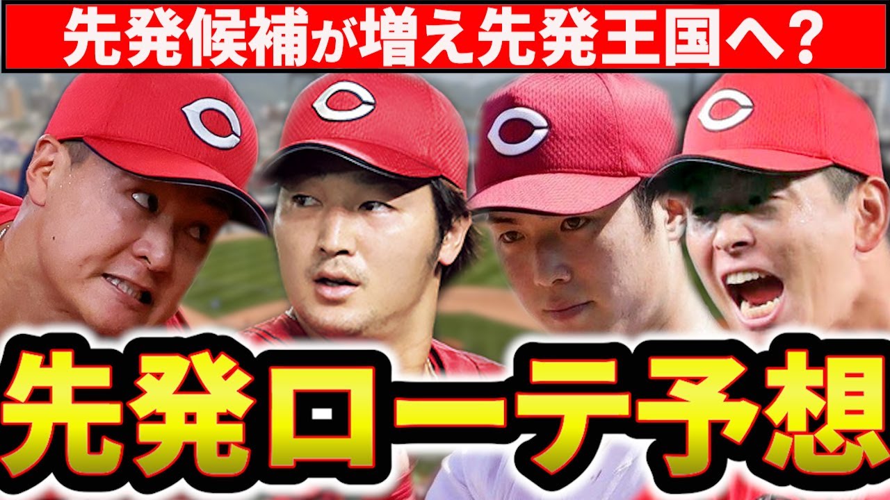 カブすき系チャンネル はい、どうもカプスきしけチャンネルです 。今回は来シーズンの先発ロテを考えて いきたいなと思います。今シーズンですね 、もうすでにもう補強といったところは ピッチャないのではないかと思います。 もう先発投手人のね、人を見えてきてるの で予想をね、していきたいと思っています 。で、来シーズンね、優勝、上位、進出を するためにはですね、この先発陣の底上げ はね、必要不可欠ですので、ま、どういう ローテがいいのか、ローテ争いでどうなる のかといったところを注目したいと思い ます。今年から先発天候となるピッチャー でしたりシスケットね、未満な点もあるん ですけど、現時点での上列といったところ もまとめましたので、是非最後までお 付き合いください。またこのチャンネルの 登録、まだの方は登録もよろしくお願い いたします。それでは内容に参りましょう 。ではまずね、今年のチームの成績振り返 。今年ですね、こちら防具率、チ防御率が 3.20ということで、え、先発は中でも 3.42という数字と終わっています。 開幕する前はですね、ま、カープ結構 ピッチャー陣は揃っているんじゃないかな という声もね、ありました。森下投手と 常田投手、え、そして大セラ投手もね、 いるということで、ま、ちょっと栗投手が ね、抜けたといったところで不安要素はね 、あったんですけど、オープン戦ではね、 森投手も良かったりして意外といけるん じゃないかと思いき山そう甘くなかった ですね。結局終わってみれば防御率先発は リーグ5位に終わってしまいました。ま、 ですのでね、ま、ここの差ってのは やっぱり大きいですよね。阪神とね、え、 ま、1点台以上ね、差があるということで 、ま、それはね、差はつけられてしまう、 え、ゲーム勝利数で言ってもね、差がつい てしまうという結果になって当然だと思い ます。で、ま、この要因としてはね、ま、 当然ね、森下投手と常田投手が、ま、 なかなかね、勝てなかった、え、という ような、ま、柱の不審ですね。特に9月は 常田投しても防御率が散々だったという こともね、ありますが、ま、ローテ全体見 てもやっぱり5番手、6番手といった ところが最後までね、生まれなかった、 判定してね、え、行かなかったというのが あるかと思います。これはまあね、武球団 も5番手、6番手はなかなか生まらないっ てのはね、あるんですけど、ま、その中で もね、いい候補、いい質のね、ピッチャー がなかなか現れなかったというのもね、 あると思いますし、ま、3番手以降ね、3 番手4番手、ま、森投し頑張ってくれまし たけど、え、その辺りもね、他の球団のね 、3番手4番手に、比べるとね、劣ってい るっていうのがあったと思います。で、 もう1個気になるのがね、ゆりあるローテ を組めなかったというところでね、ま、 特田投手なんかもね、シーズン通して ずっとね、ほぼ中日で出回っていました。 え、卓球団見ると、ま、巨人もね、途中で 山崎より投手抹勝したりね、え、例えね、 エース級のピッチャーであってもしっかり と休みを挟んでシーズンね、投げてもら うっていう運用ができていたんですけど、 ま、そこがカープはできなかったという ところもしかしたら9月の失速と絡んで いるんじゃないかなと思います。ま、です のでチーム全体としてですね、先発候補の ですね、速攻上げといったところも必要 ですし、ま、枚数も増やさないといけない というとこがね、課題になってくるんじゃ ないかなと思ってます。で、今年はね、 先発展して栗林投手、岡本投手、辻投手が いる。で、さらに新スケットでターノック 投手を獲得するということで、ま、現時点 での先発候補のね、母数といったところは ね、多くなっています。ま、なのでこの中 で、ま、ロテで言うと6人ですね、6人の 枠を勝ち取るのが誰なのか。ま、現時点で のね、濃厚と考えられる人でしたりね、ま 、そういった序列をね、個人的につけてみ ましたのでね、そちらもね、確認してみ ましょう。こちらがね、個人的にけた上列 となっています。1番左のとこね、ABC とつけているところ、ま、Aの方が角度 高いんじゃないかなというところです。ま 、上から見ていきますと、ま、Aとしてる のは常田投手と森下投手です。ま、ここは ね、当然かなと思ってますね。田投手は 今年26試合登板して、え、3.15とね 、成績はね、ちょっと落としてしまいまし たが、ま、関東とかもね、多くしてくれて イニングね、これだけ稼いでくれています ので、ま、これはもうローテには欠かせ ない存在だと思います。で、森下投手もね 、22先発で152回1/3に投げて防御 率[音楽]もね、チームトップとなって おります。勝ち星にはね、恵まれません でしたが、試合はね、作ってくれていまし たので、ま、ロテにはね、やっぱり外せ ないかなというとこで、ま、この2人が やっぱり来シーズンもね、中心選手となっ てくれるんじゃないかと思い