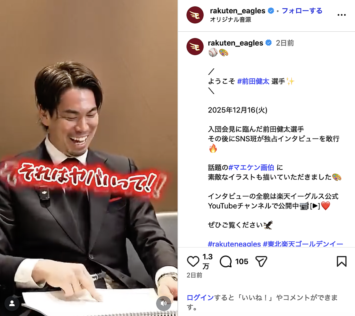 東北楽天ゴールデンイーグルスが12月16日、Instagramを更新。楽天に新加入した前田健太(37)のインタビュー動画を公開した。